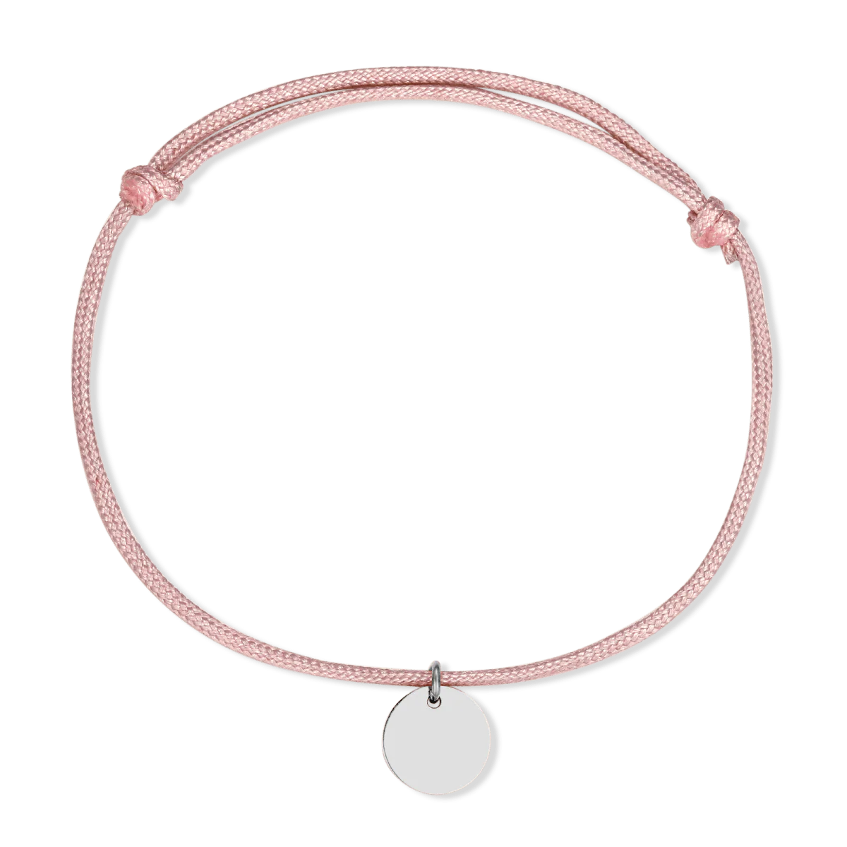 𖥾 Pulsera de cuerda con nudos corredizos ajustable de color rosa pálido y un colgante circular plano. Puedes adaptarla cómodamente a la medida de tu muñeca.