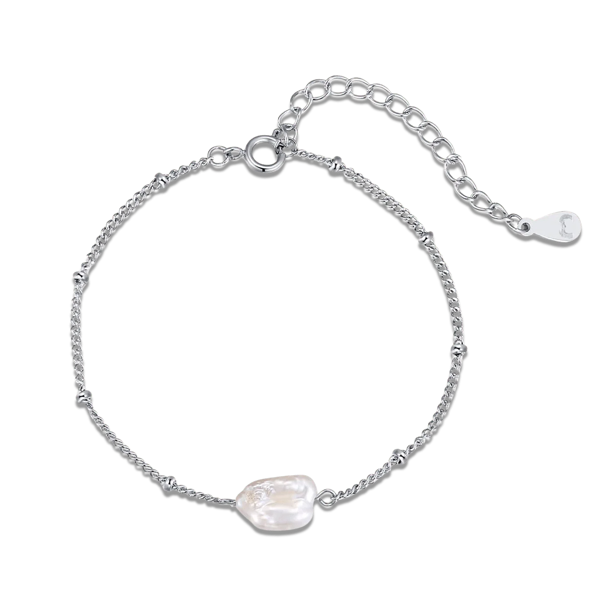 Pulsera con una hermosa perla rosa, rodeada de bolitas, en acero inoxidable de la mejor calidad (316L).