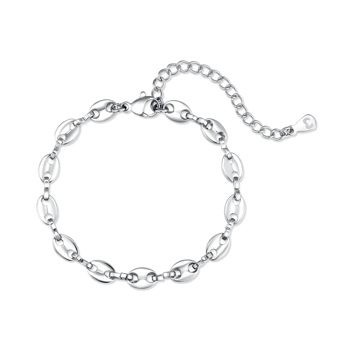 Pulsera formada por figuras ovales, distribuidas alrededor de la cadenita, en plata de primera ley (S925).