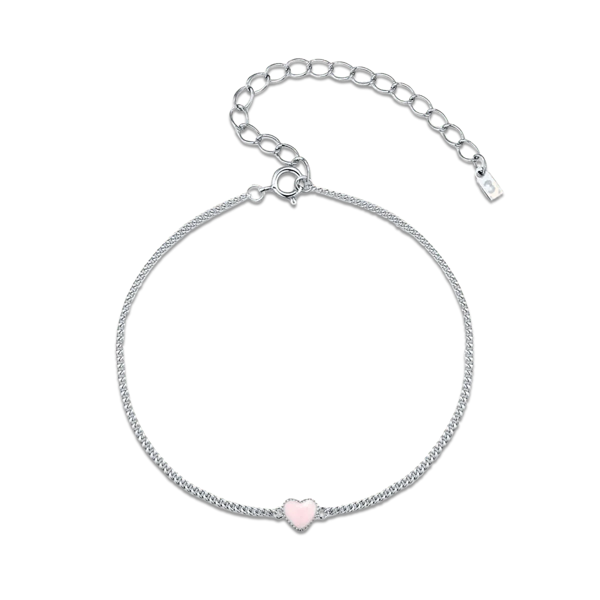 Pulsera con un delicado corazón rosa en su centro, en plata de primera ley (S925).