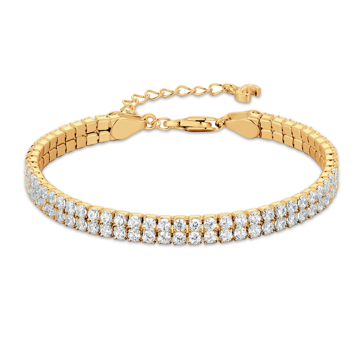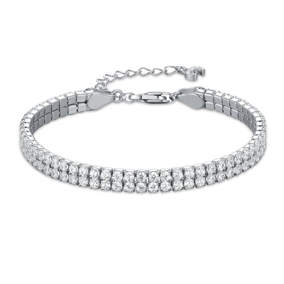 Pulsera flexible con dise帽o de doble fila o hilera, formadas por circonitas blancas y brillantes, incrustadas a lo largo de toda la joya, en plata de primera ley (S925).