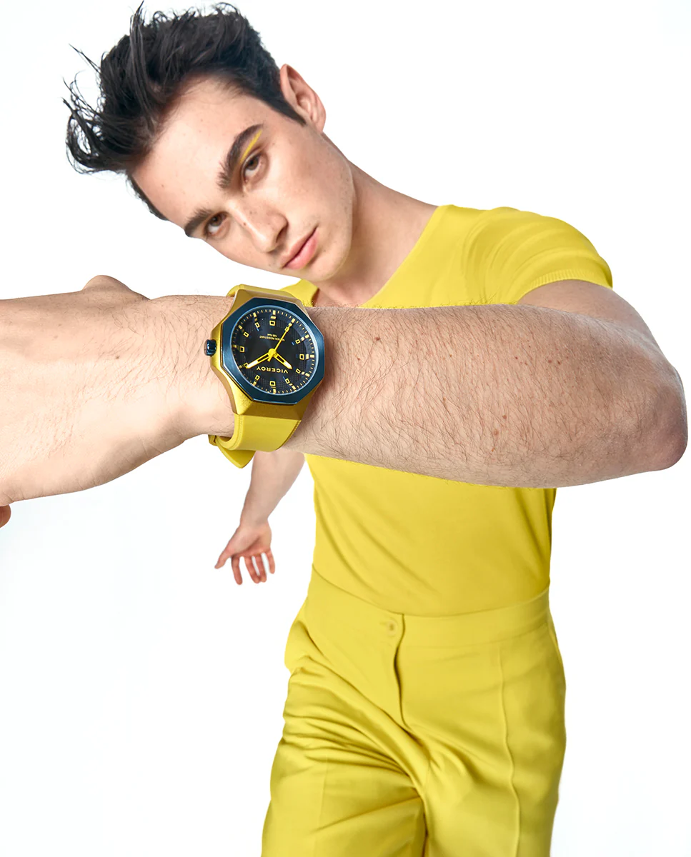 Reloj Aluminio Amarillo Y Acero Ip Azul Correa Sr