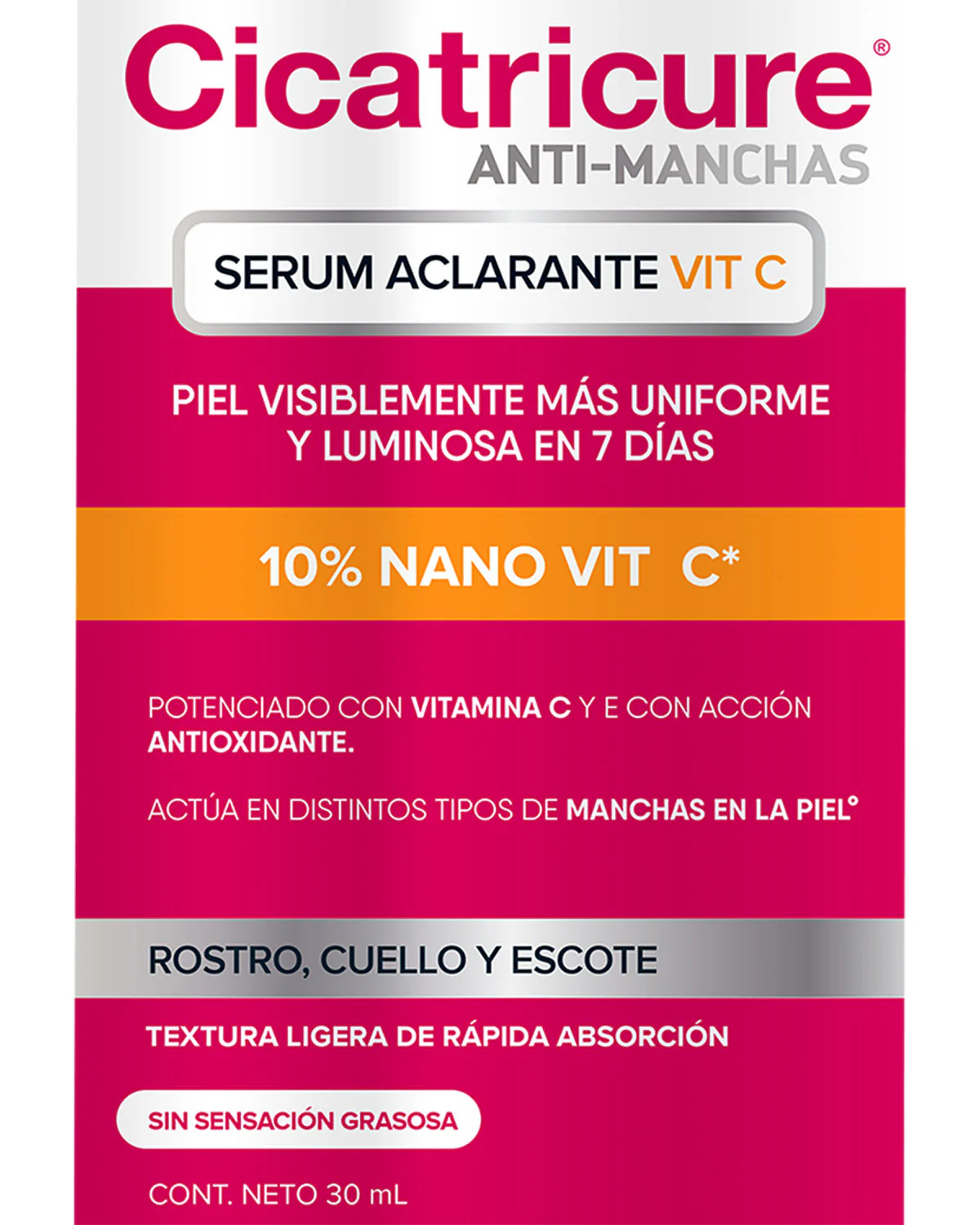 El Sérum Cicatricure Aclarante Vitamina C es un producto avanzado diseñado para abordar las preocupaciones relacionadas con las manchas en la piel. Su fórmula se basa en una alta concentración de vitaminas C y E, dos poderosos antioxidantes conocidos por sus beneficios para la piel. Estos antioxidantes trabajan en conjunto para promover una piel más uniforme y luminosa. Una de las ventajas clave de este sérum es su capacidad para actuar contra diversos tipos de manchas en la piel. Ya sea que se trate de manchas de sol, pigmentación irregular o cualquier otra causa, este sérum está formulado para ayudar a reducir la apariencia de estas imperfecciones, promoviendo una piel más clara y de aspecto más saludable.