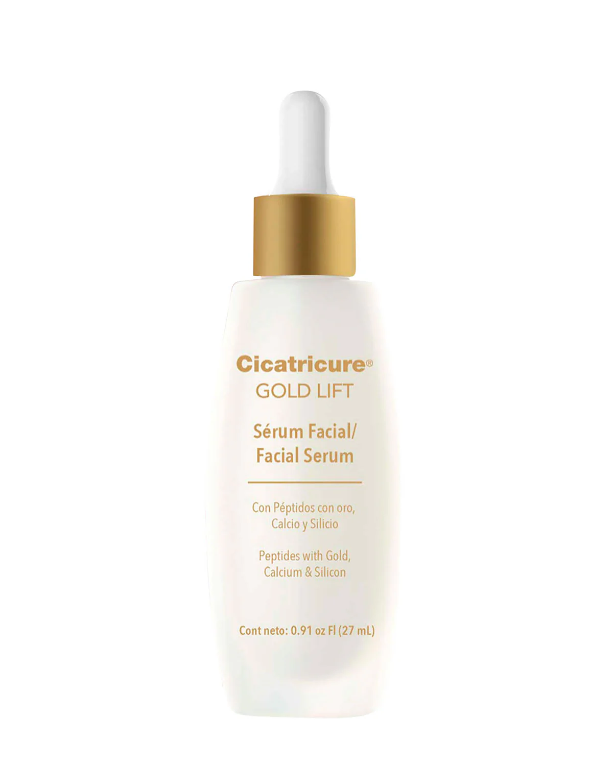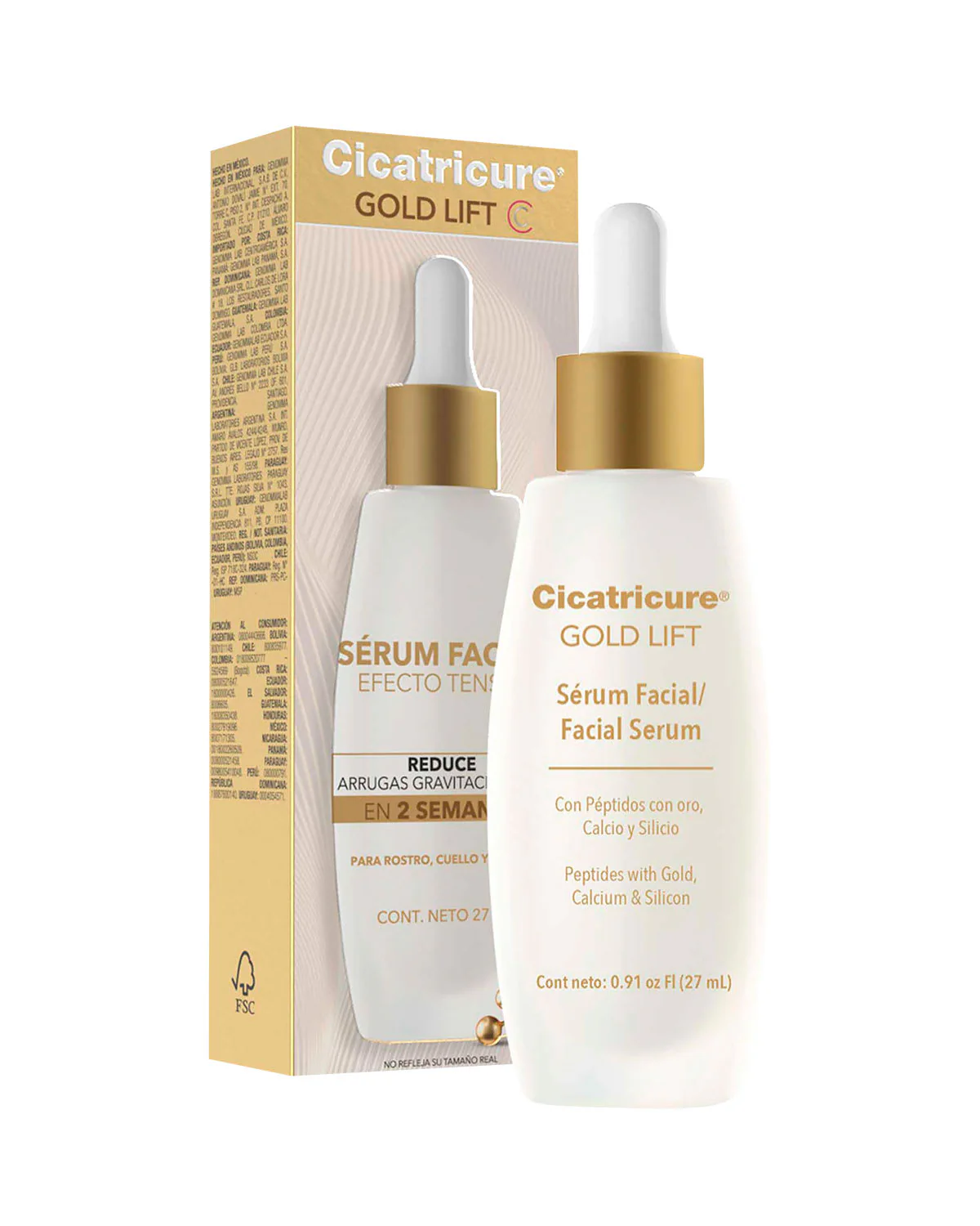 El nuevo serúm facial de Cicatricure Gold actúa sobre arrugas gravitacionales y líneas de expresión, su fórmula concentrada con Péptidos con oro, Calcio y Silicio actúa con efecto lifting y se absorbe rápidamente, permitiendo una reparación más profunda de la piel en menos tiempo. Al instante su efecto tensor mejora la elasticidad y humectación de la piel y conforme pasan los días incrementa la firmeza, dando como resultado un rostro más definido. En sólo 2 semanas esculpe y reafirma la piel y reduce la aparición de arrugas gravitacionales.