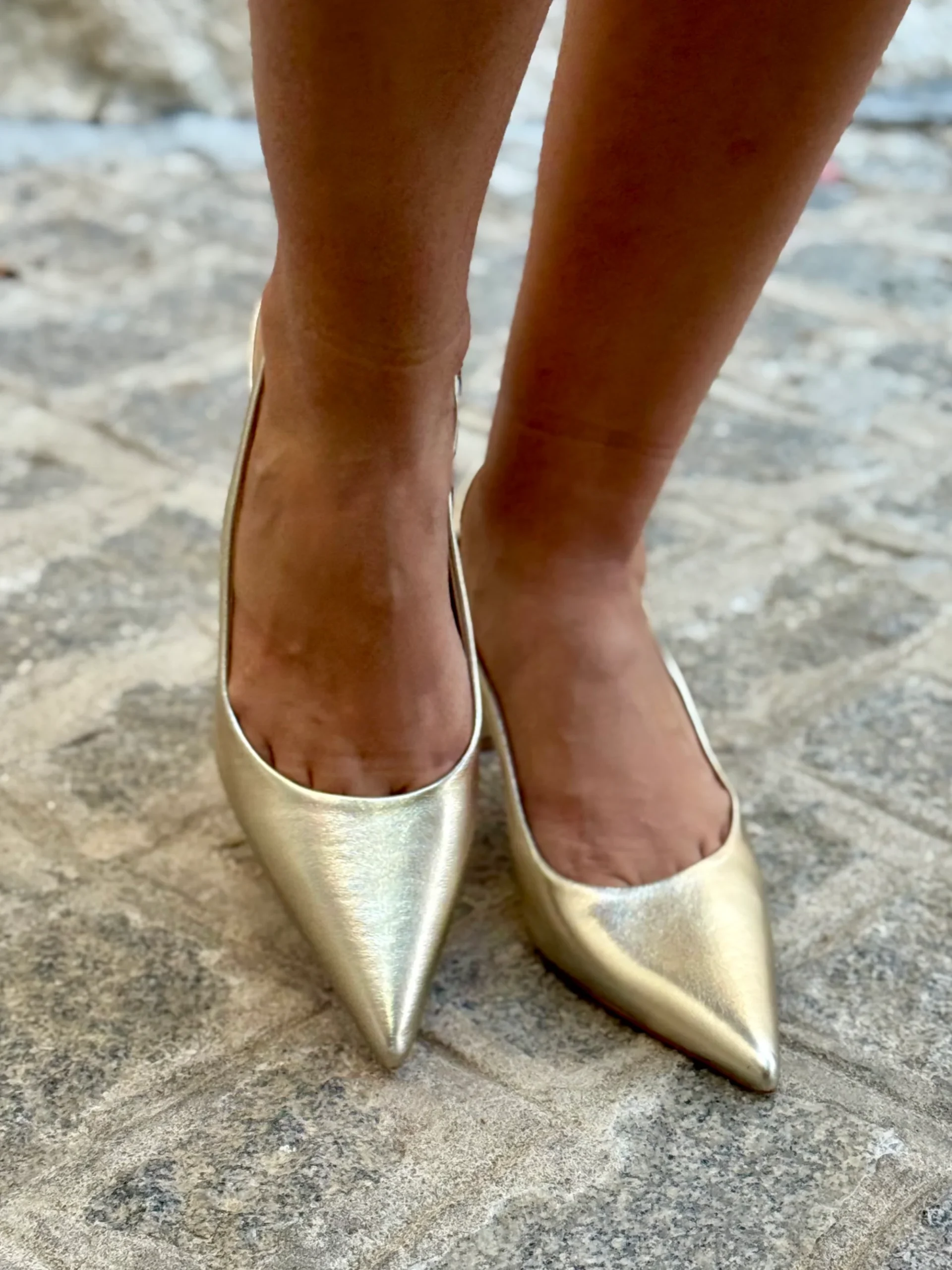 Estos stilettos dorados con tac贸n de 7 cm destacan por su punta fina y la tira el谩stica en el empeine, que aporta un detalle sofisticado y moderno. El estilo destalonado con pulsera ajustable asegura ligereza y confort en cada paso, convirti茅ndolos en el zapato ideal para quienes buscan altura media sin renunciar al glamour.
