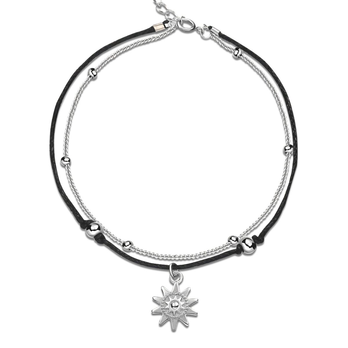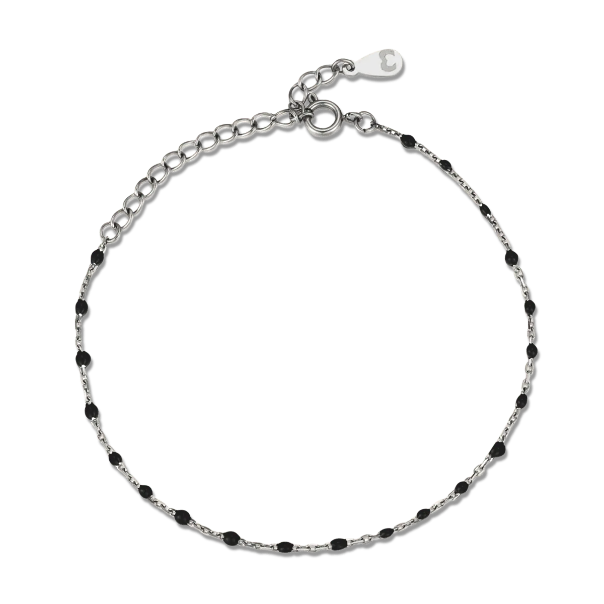 Tobillera de cadena ajustable con bolitas negras, en acero inoxidable quirúrgico (316L).