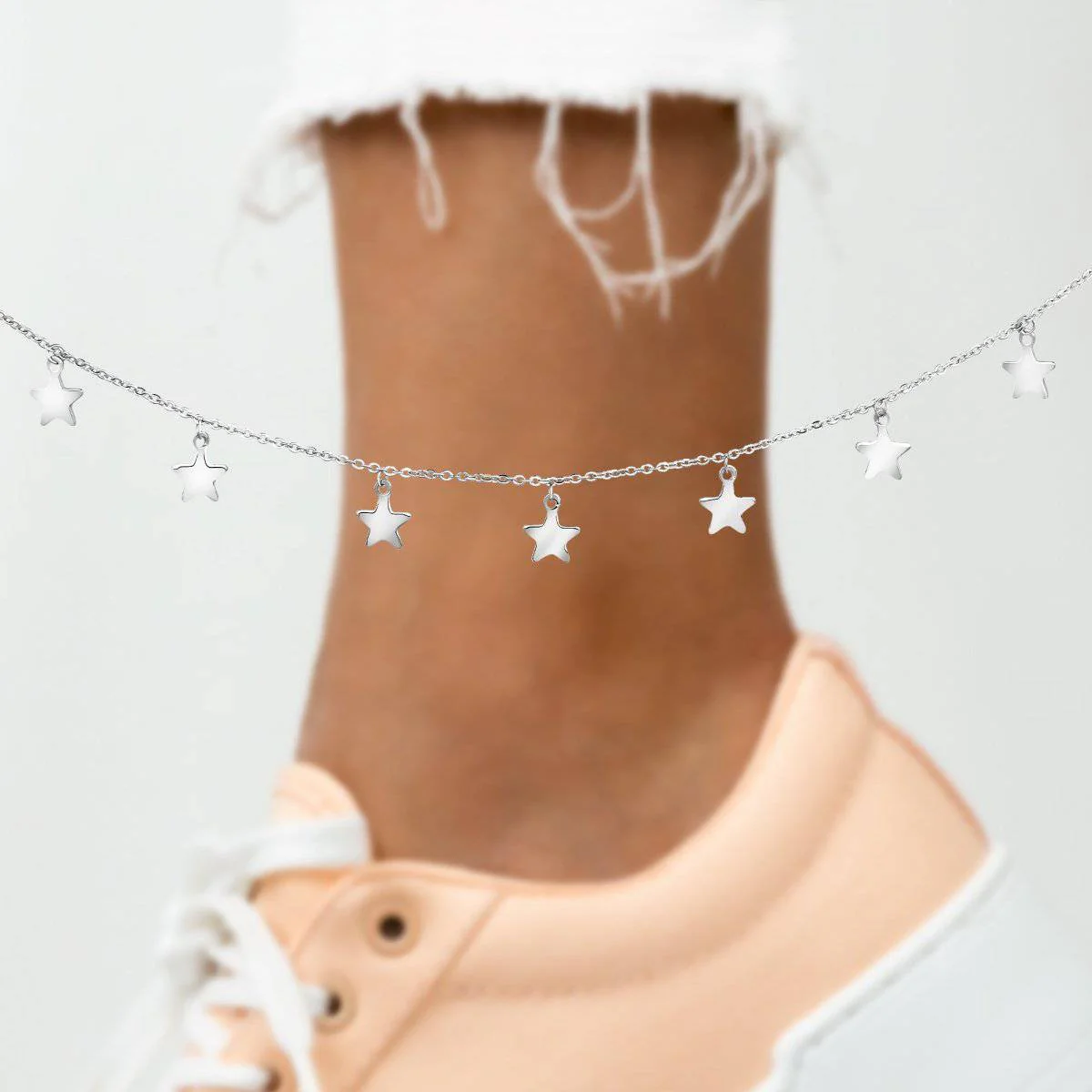 La tobillera «Llluvia Estrellada» tiene un bonito diseño clásico, adornado con estrellas que cuelgan alrededor de toda la cadena. Disponible en color plata.