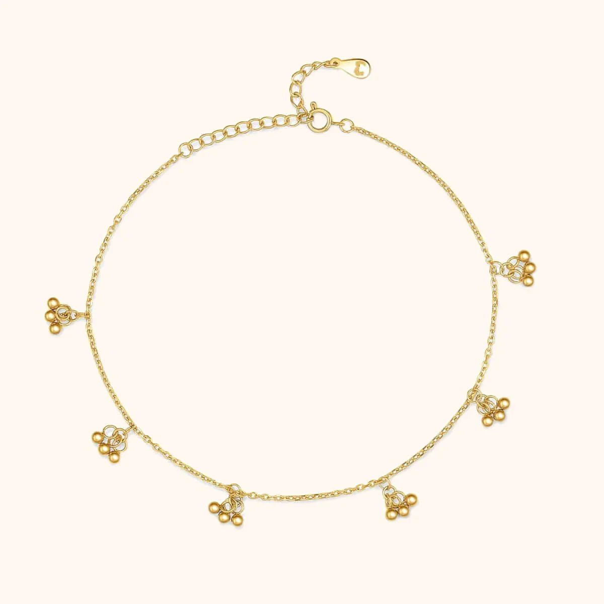 Preciosa tobillera decorada con pequeños aritos enlazados y mini bolitas colgantes, en acero inoxidable quirúrgico (316L).