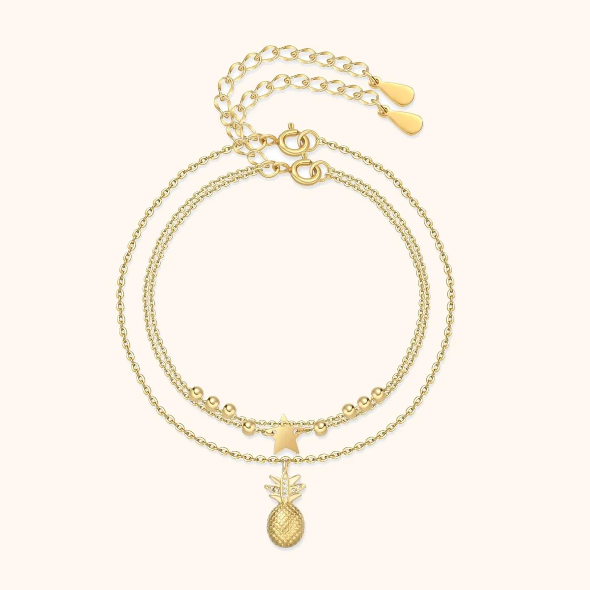 Tobillera con un diseño muy bonito de triple cadenita, una de ellas adornada por una estrella, otra con bolitas y la tercera con una piña tropical.