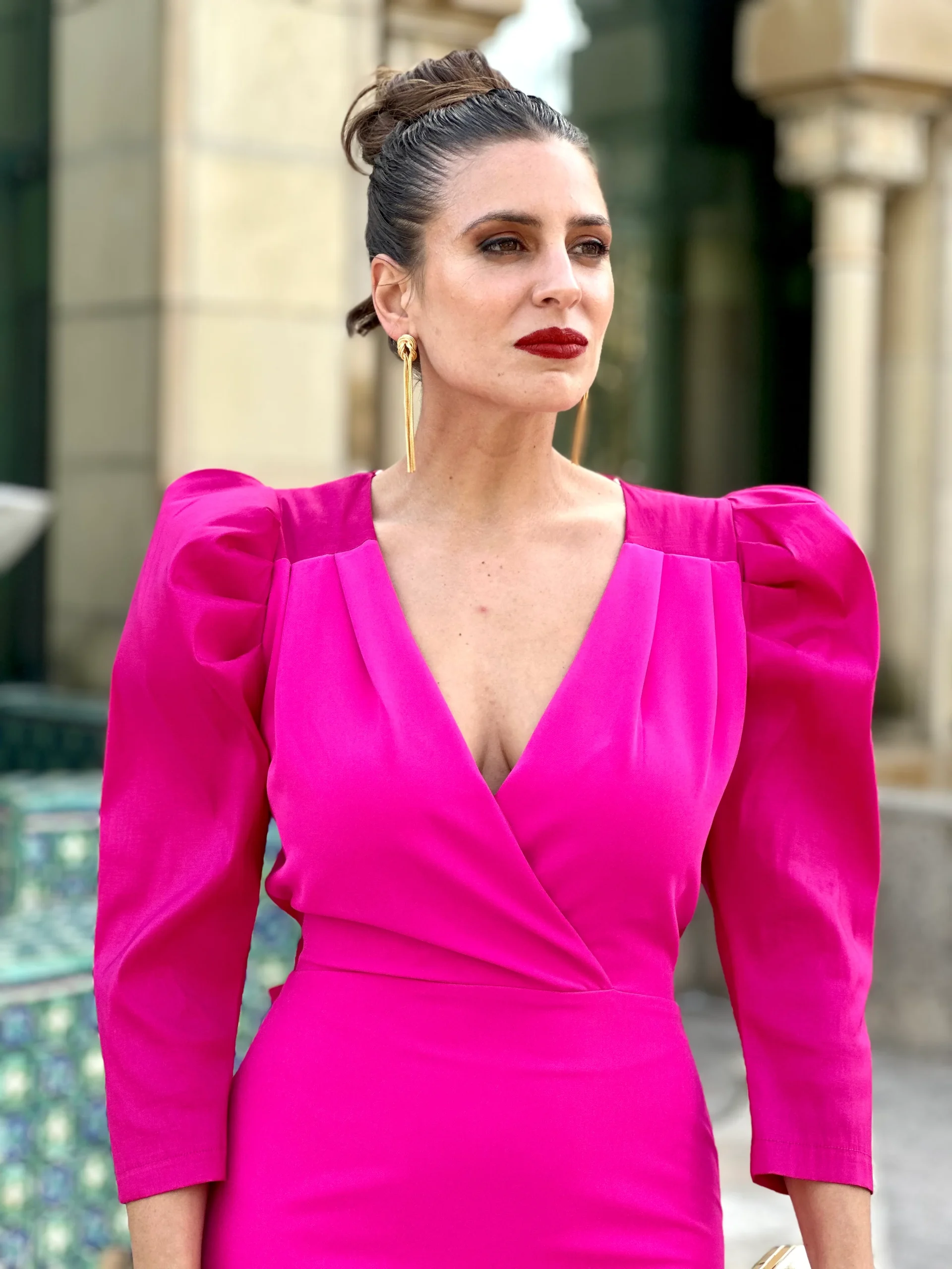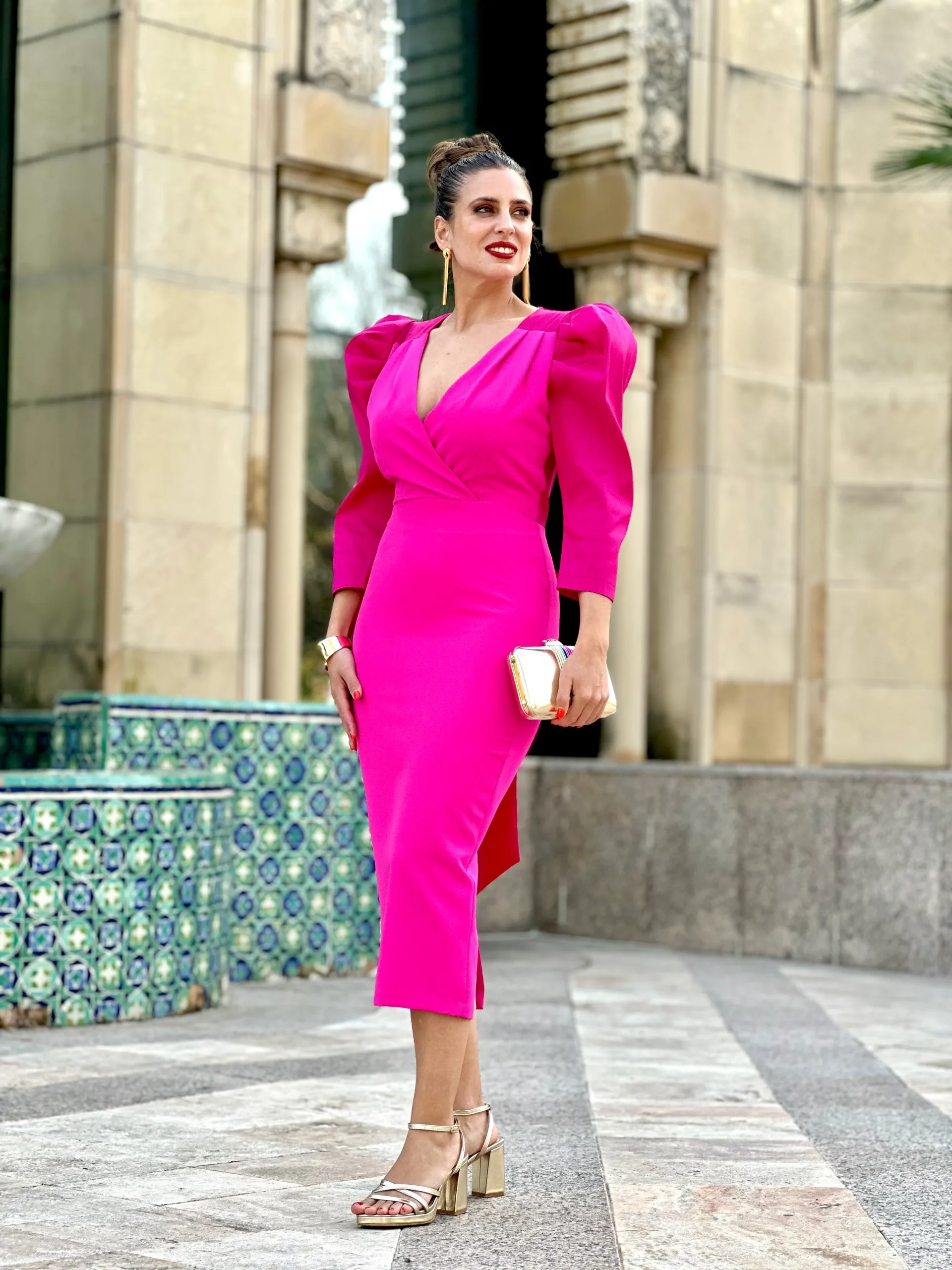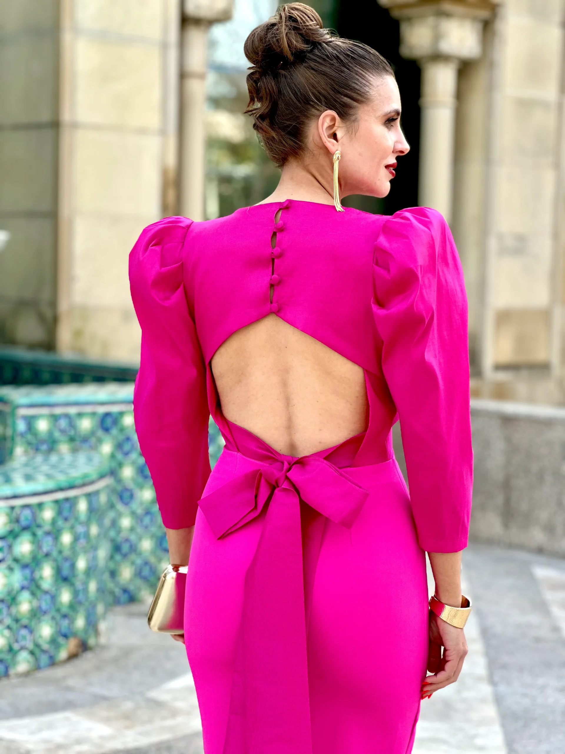 Vestido midi con escote en V, mangas de tafetán abullonadas con hombreras, espalda descubierta que cierra con botones, falda ajustada al cuerpo con abertura trasera. Tiene forro.