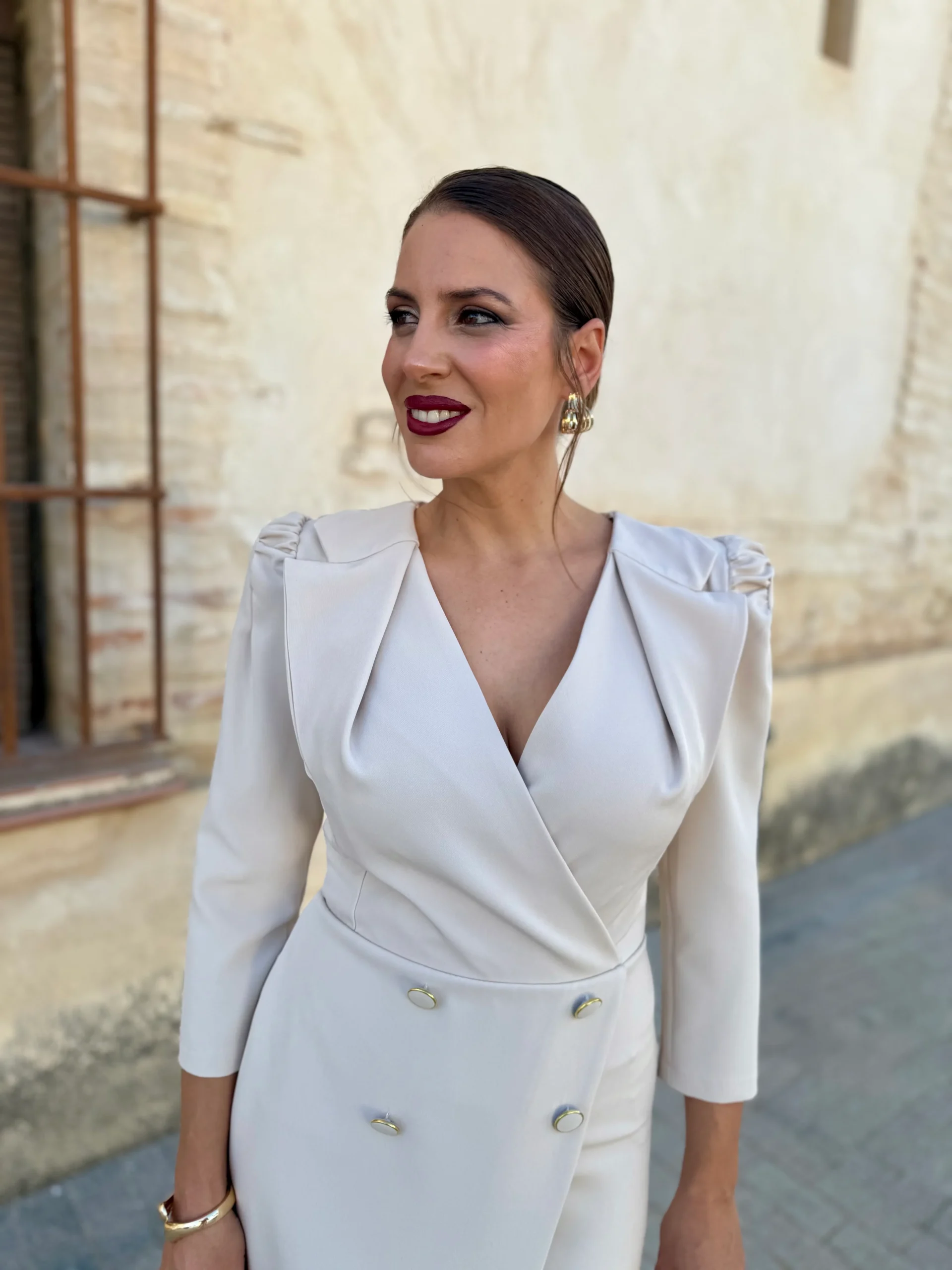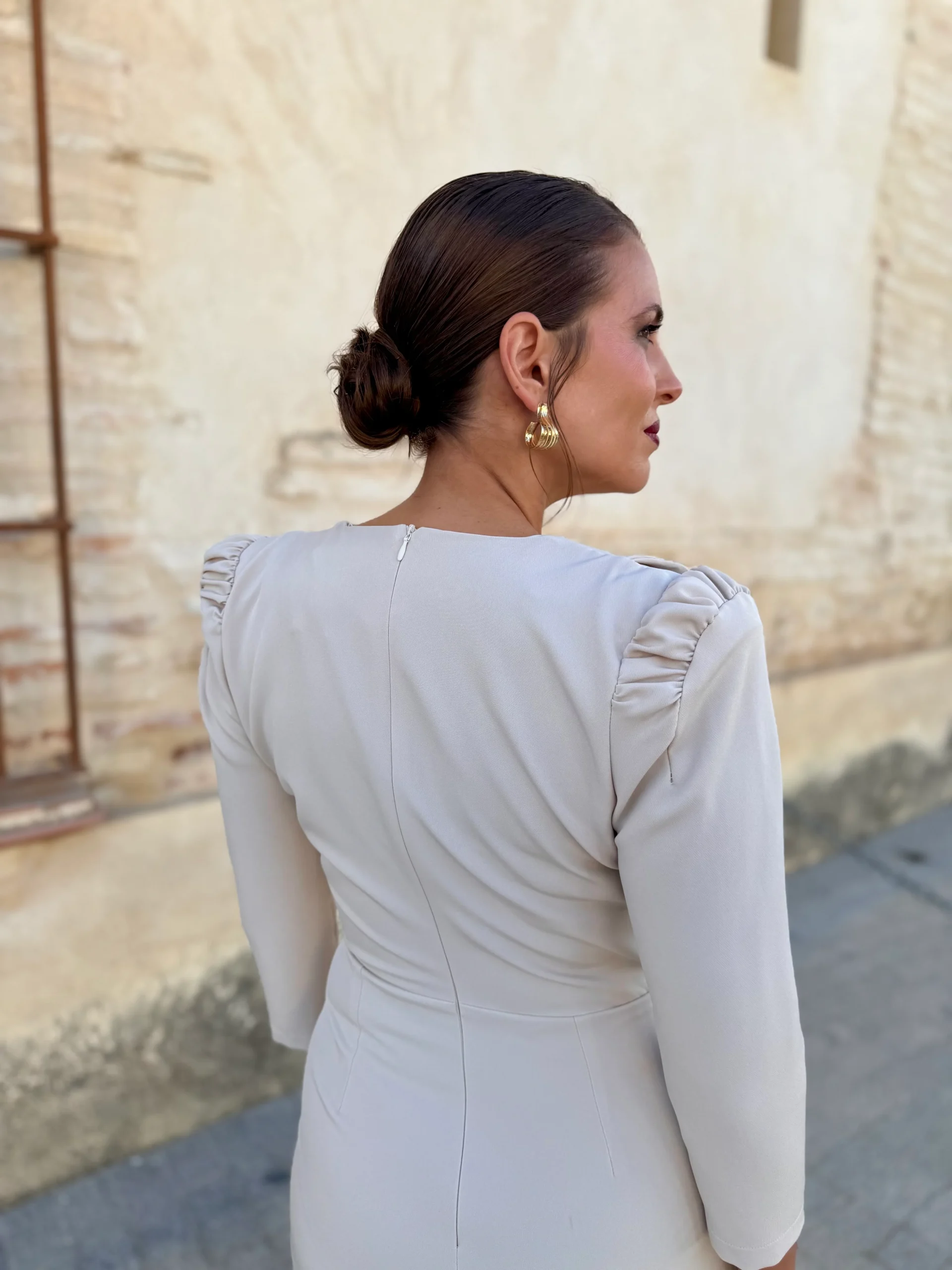 Perfecto para quienes buscan un look sofisticado y minimalista, este vestido en tono neutro se combina fácilmente con complementos dorados, nude o metalizados. Añade unas sandalias de tacón fino y un clutch para un resultado impecable.