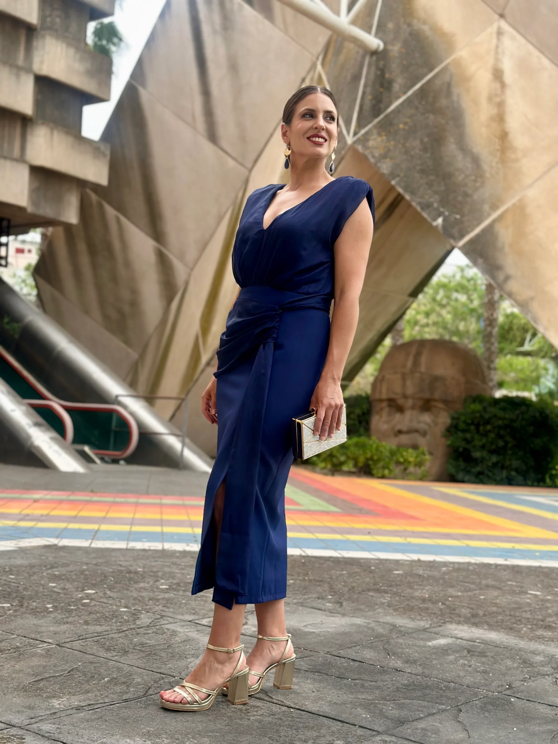 El Vestido Celina es sinónimo de elegancia atemporal. Con escote en pico y drapeado fluido en el cuerpo, este diseño en azul estiliza la figura y aporta un movimiento sutil y cómodo.
