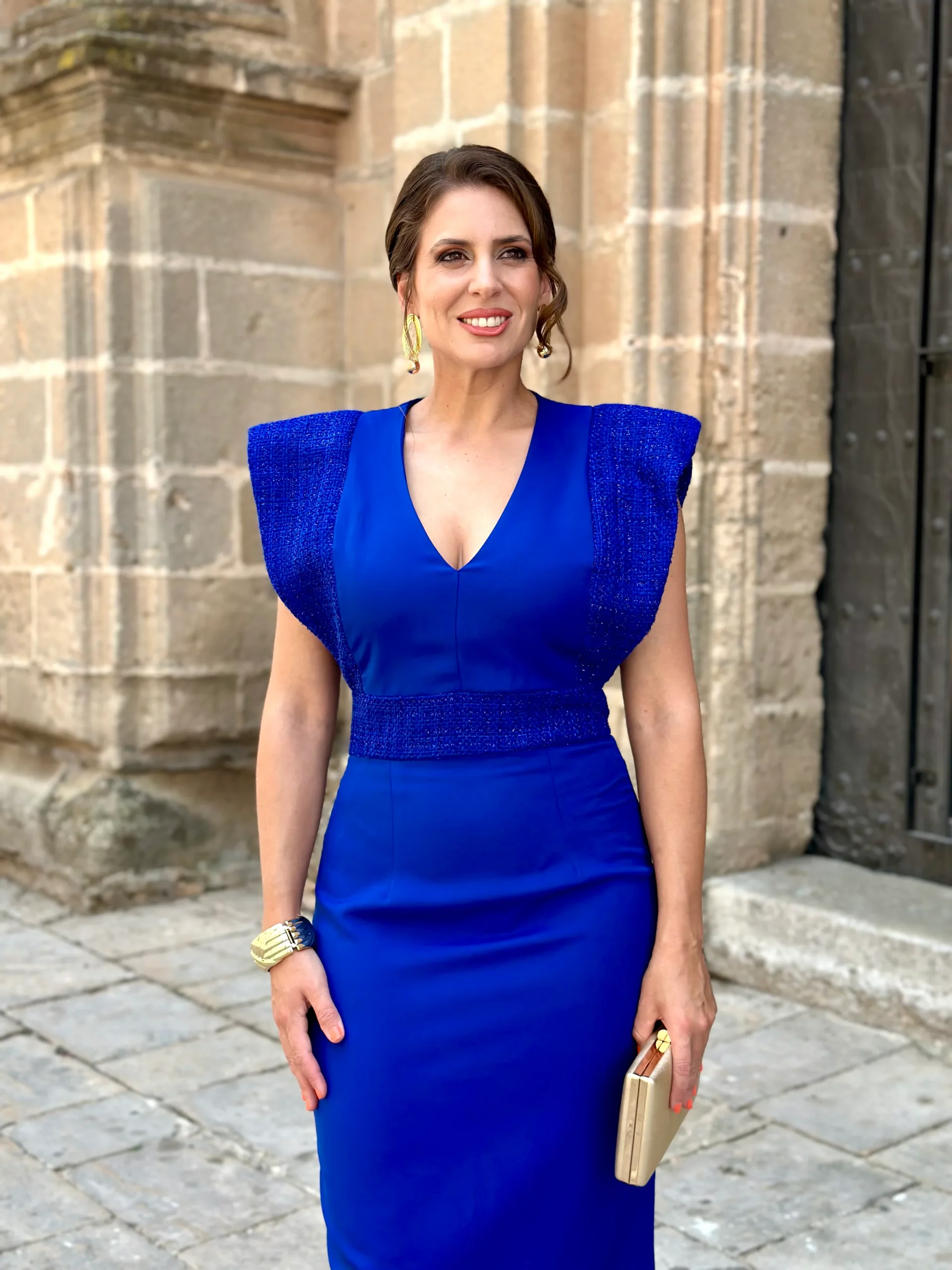 El vestido Azul Imperio deslumbra con su tono el茅ctrico y dise帽o estructurado, realizado por unas mangas de efecto capa con textura y un favorecedor escote en pico.