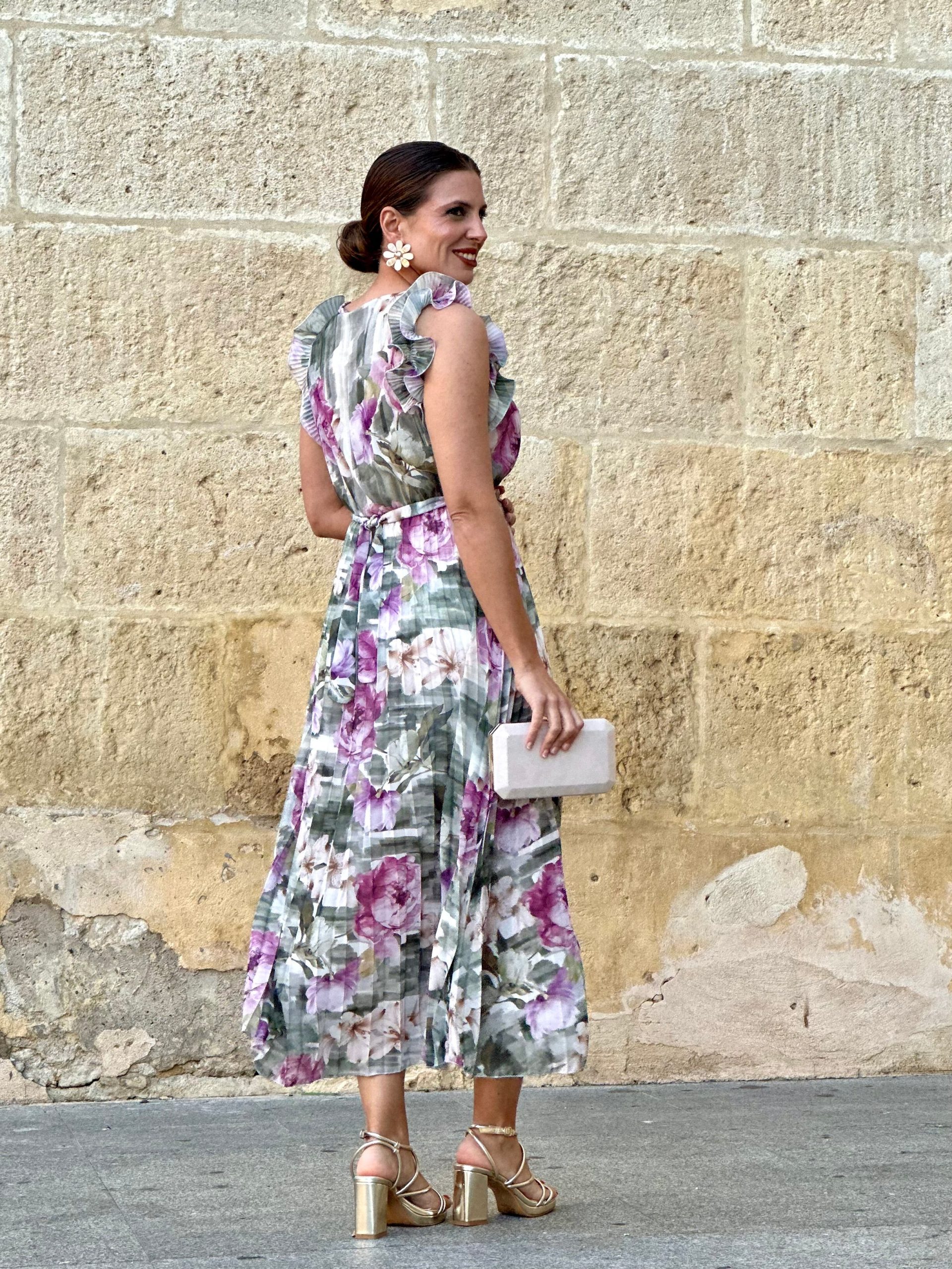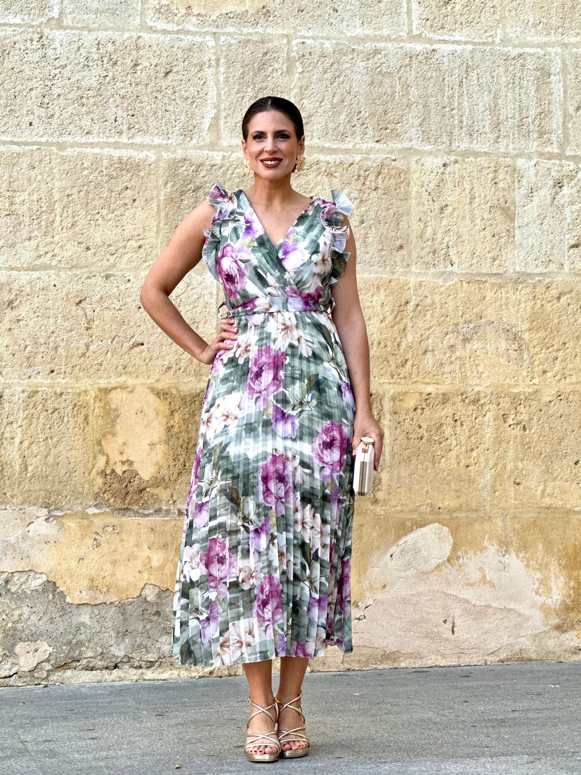 Vestido sin mangas, de gasa con forro interior, escote en V cruzado, cinturilla elástica, que incluye cinta desmontable y falda plisada con vuelo y suave caÃda.