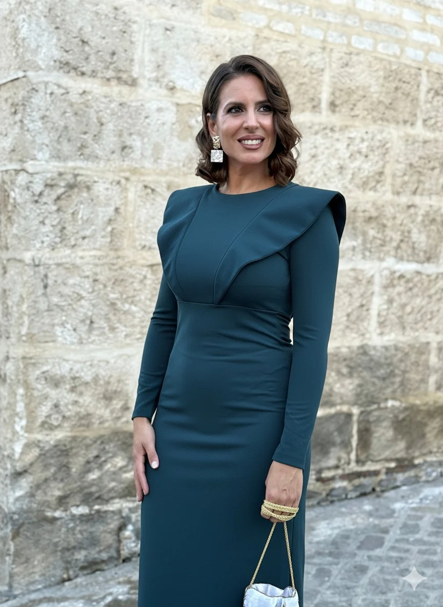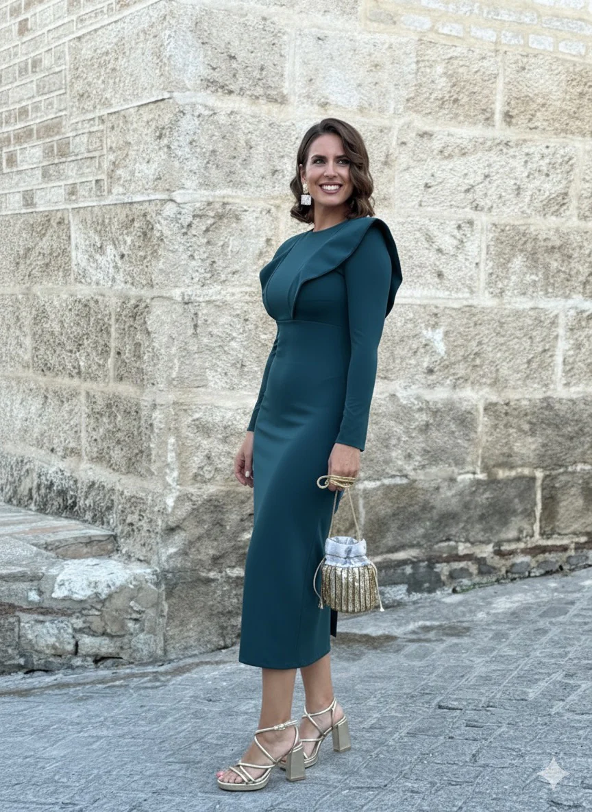 Deslumbra en tu próximo evento con este vestido de invitada midi. Su diseño con manga larga y hombreras marcadas aporta un toque elegante y sofisticado, ideal para bodas de día, comuniones o celebraciones especiales.