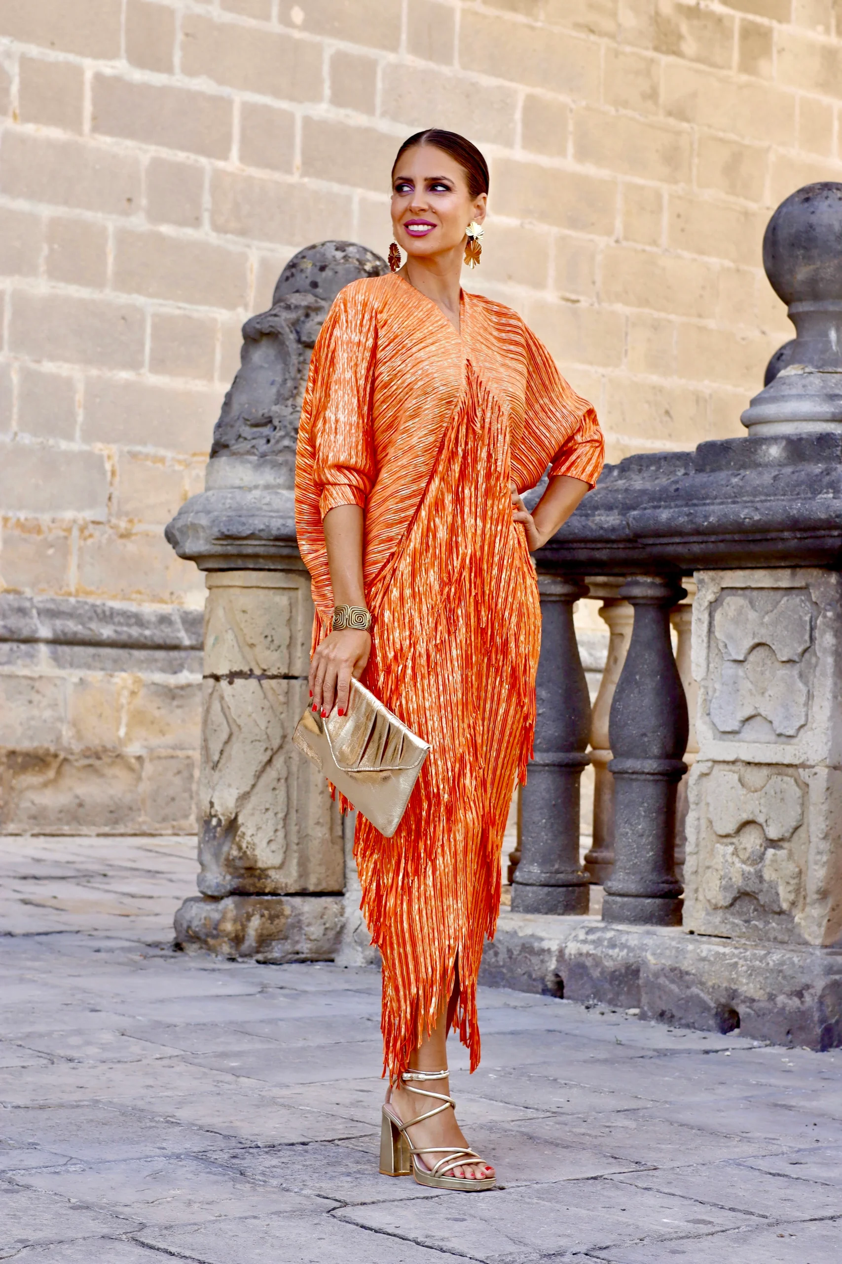 Déjate envolver por la elegancia etérea del Vestido Messina Naranja. Diseñado para mujeres que buscan un look sofisticado y único, este modelo destaca por su tejido ligero con destellos irisados en tonos lavanda y su original diseño de flecos en cascada que aportan un movimiento espectacular a cada paso. Su corte fluido y favorecedor se adapta a todo tipo de siluetas, convirtiéndolo en la elección perfecta para bodas, comuniones, fiestas o cualquier evento especial.