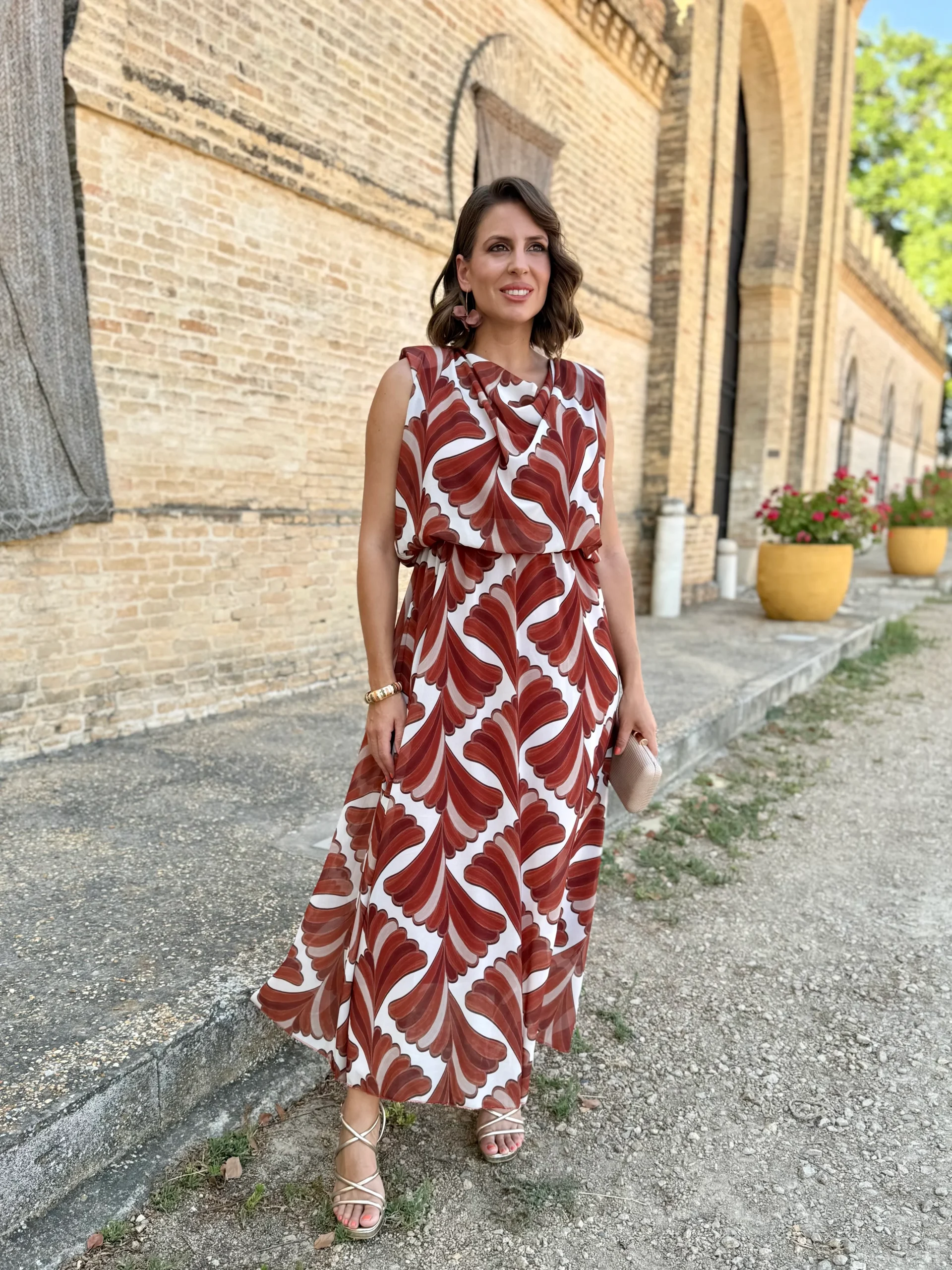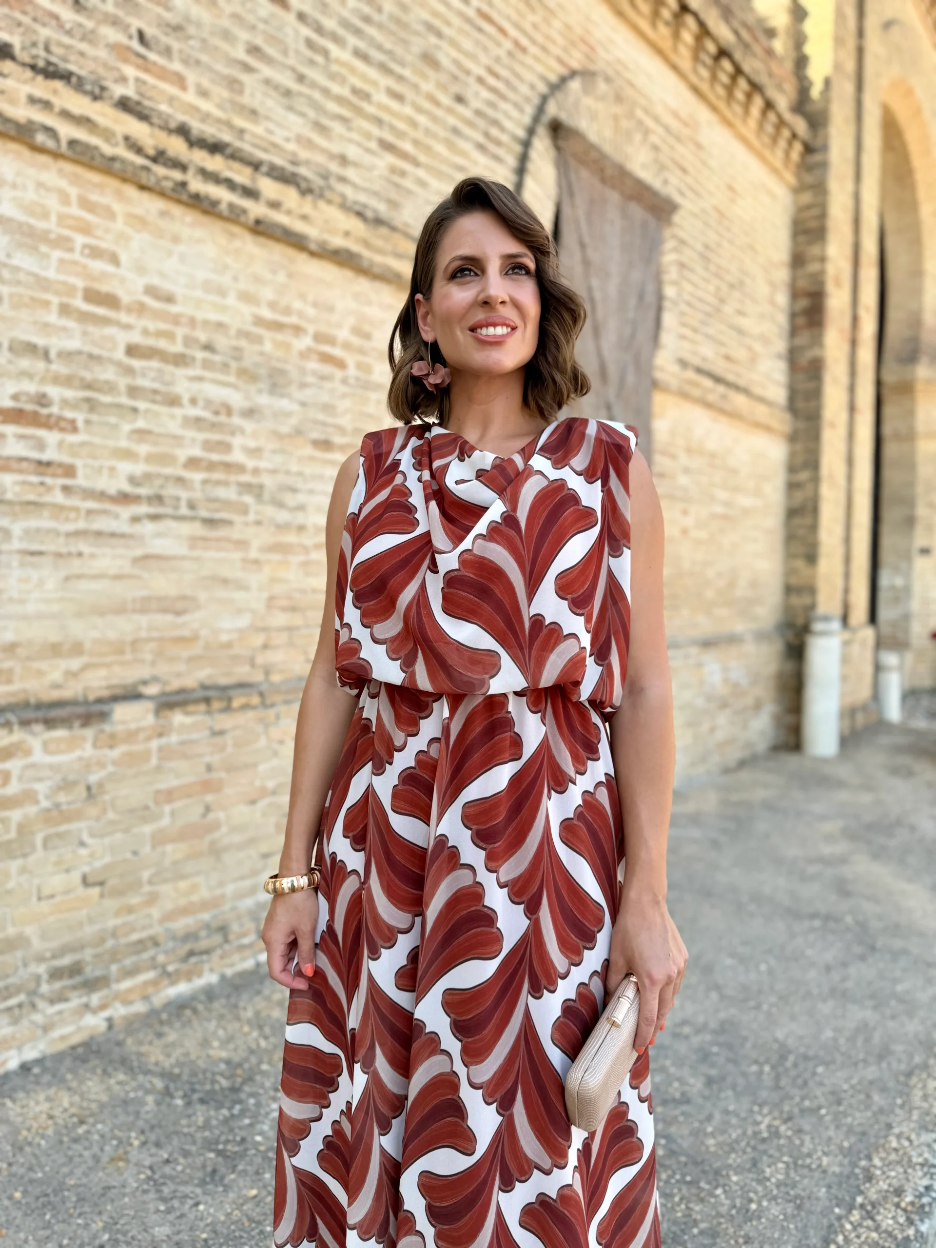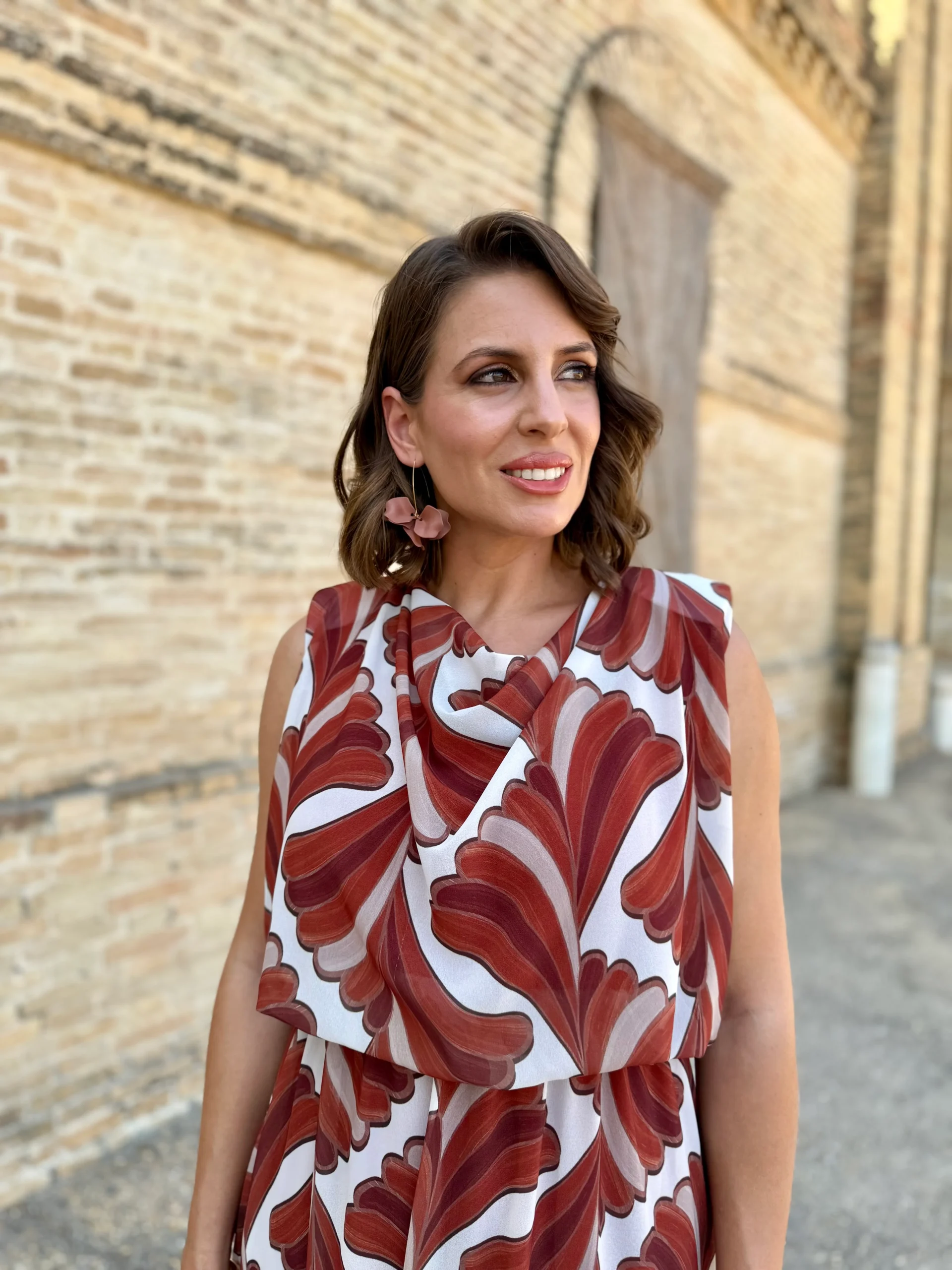 El vestido Oriana es una oda a la elegancia relajada. Con un estampado geométrico de ondas que aporta dinamismo y frescura, su diseño de escote drapeado y corte fluido estiliza la figura de manera natural.