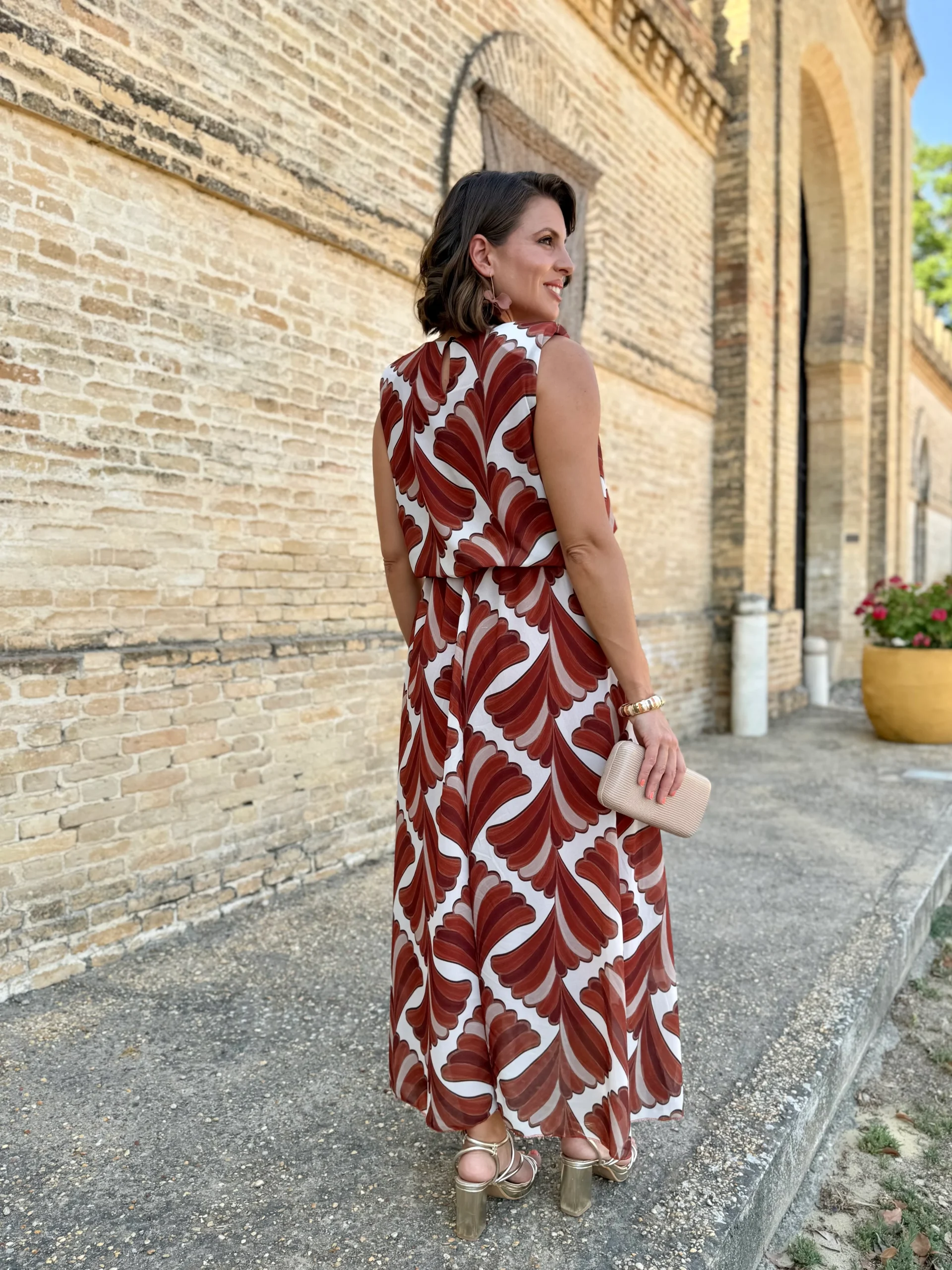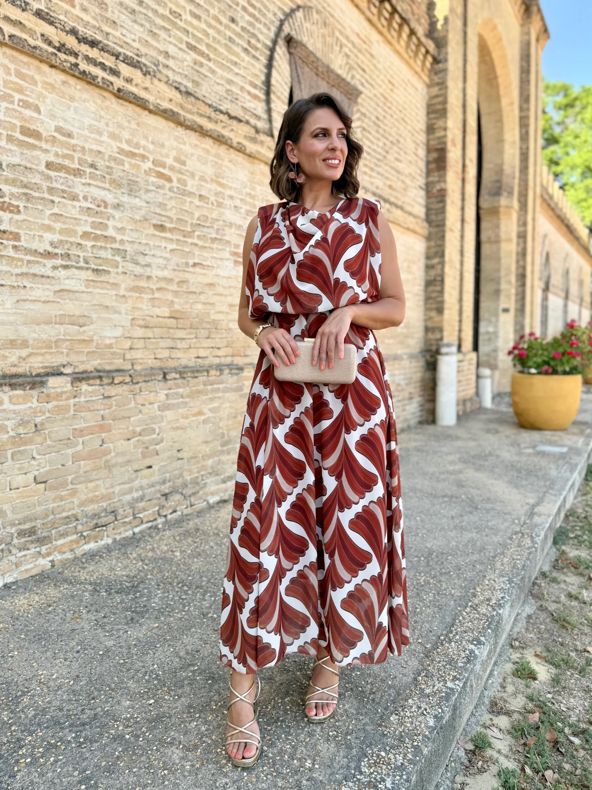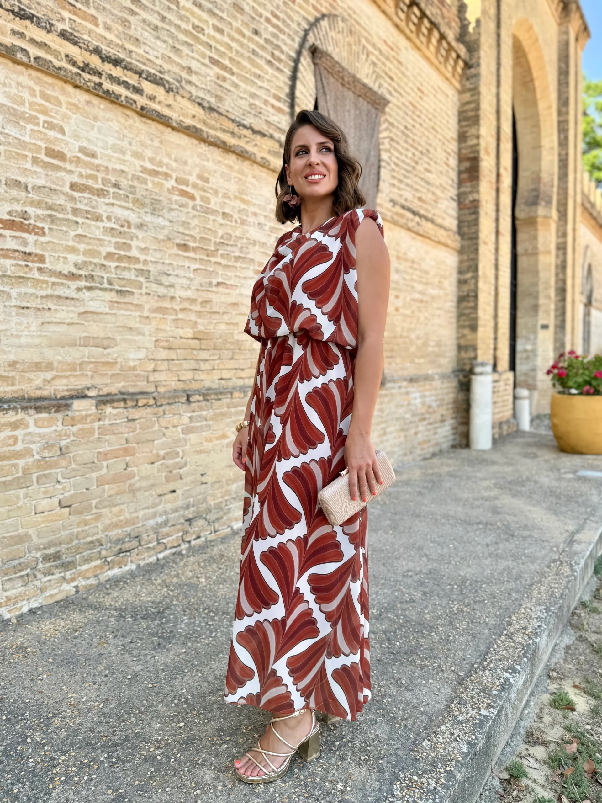 El vestido Oriana es una oda a la elegancia relajada. Con un estampado geométrico de ondas que aporta dinamismo y frescura, su diseño de escote drapeado y corte fluido estiliza la figura de manera natural.