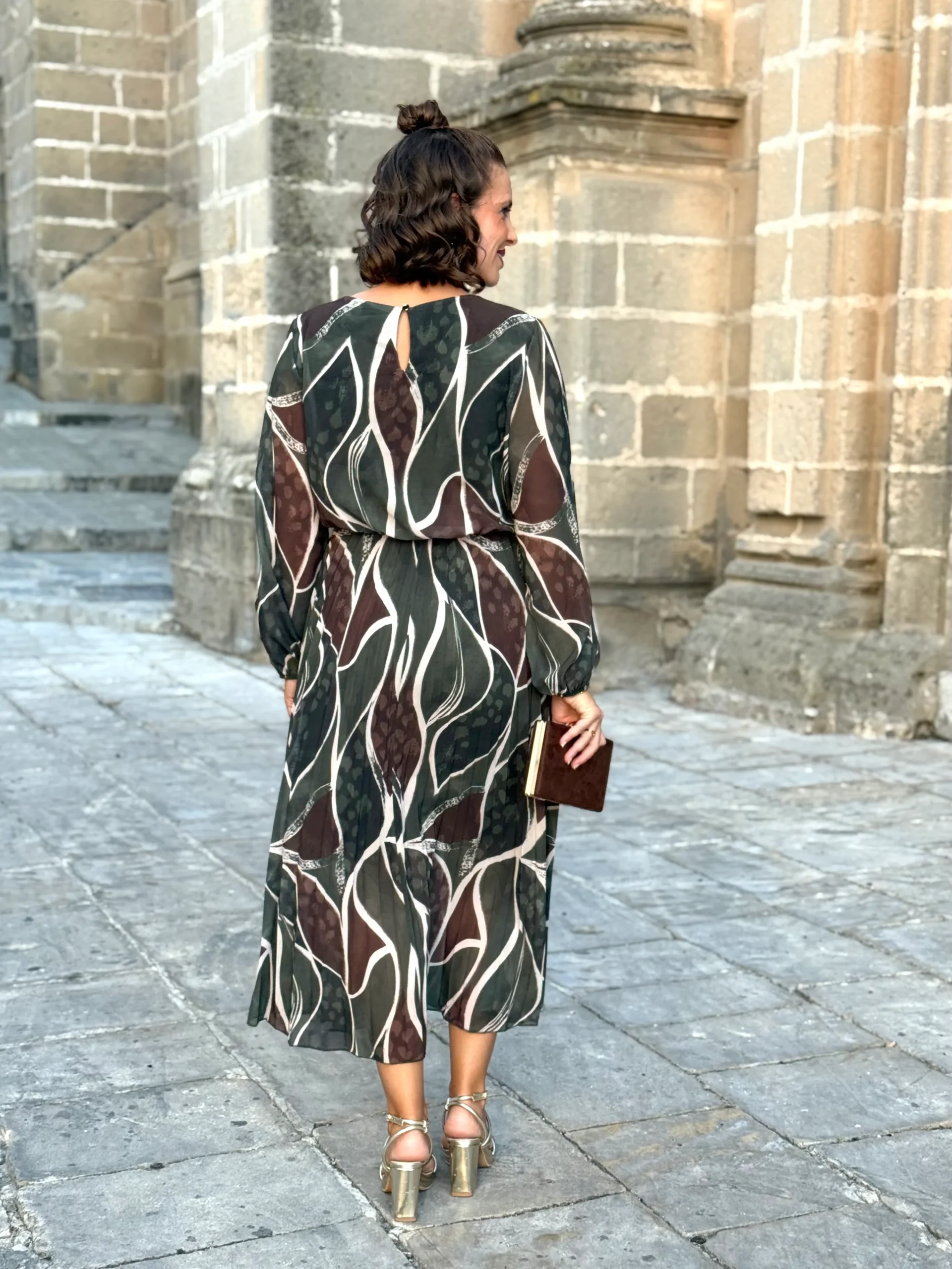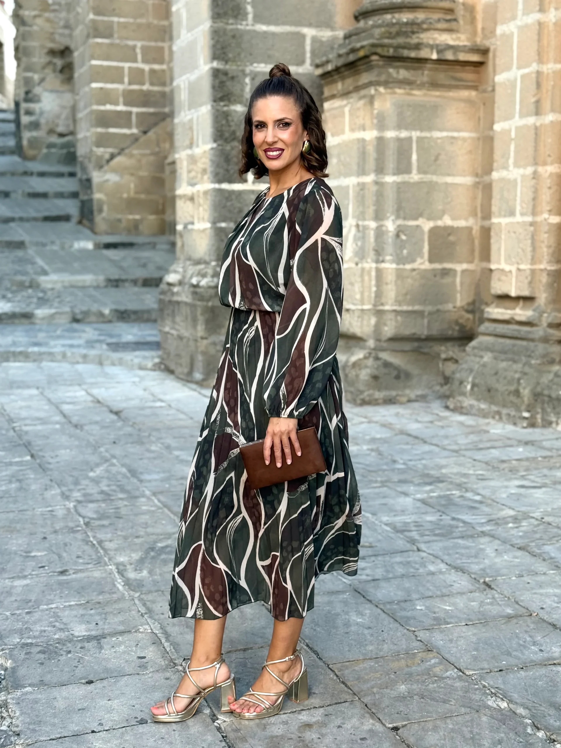 Este vestido midi es sinónimo de frescura y elegancia. Su estampado transmite un aire sofisticado, ideal para bodas de día o celebraciones especiales. La parte superior con efecto capa aporta un movimiento sutil y favorecedor, mientras que las mangas francesas lo hacen perfecto para eventos de entretiempo.