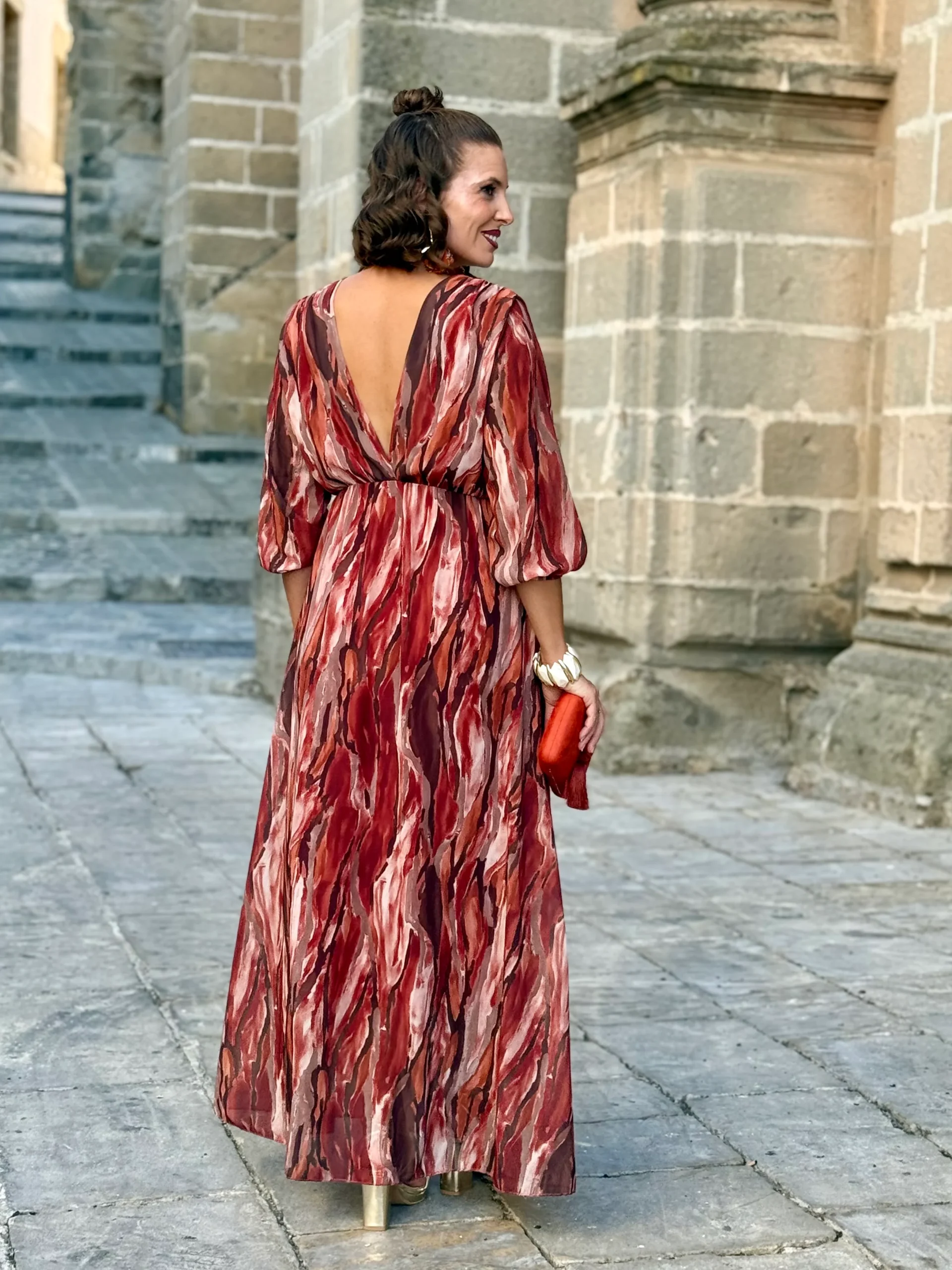 Deslumbra en cualquier evento con este vestido largo de gasa estampada con efecto pinceladas, disponible en dos tonos irresistibles: azules con marrones y rojos con teja.