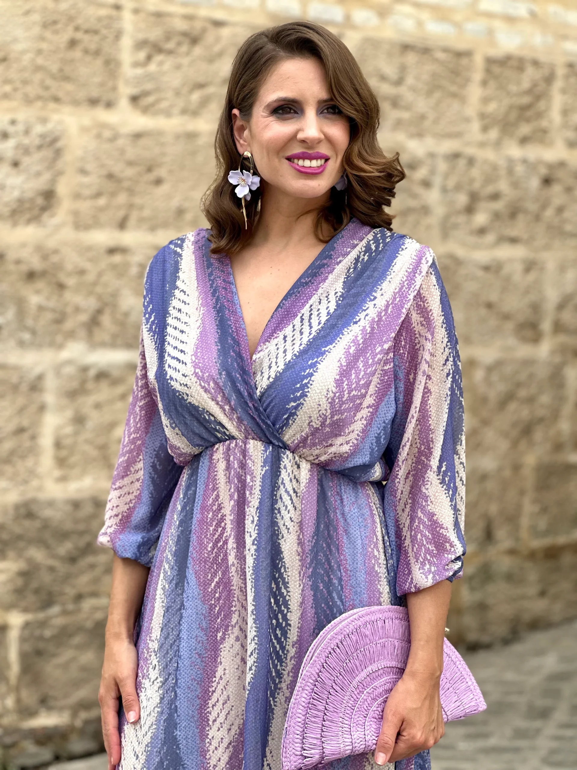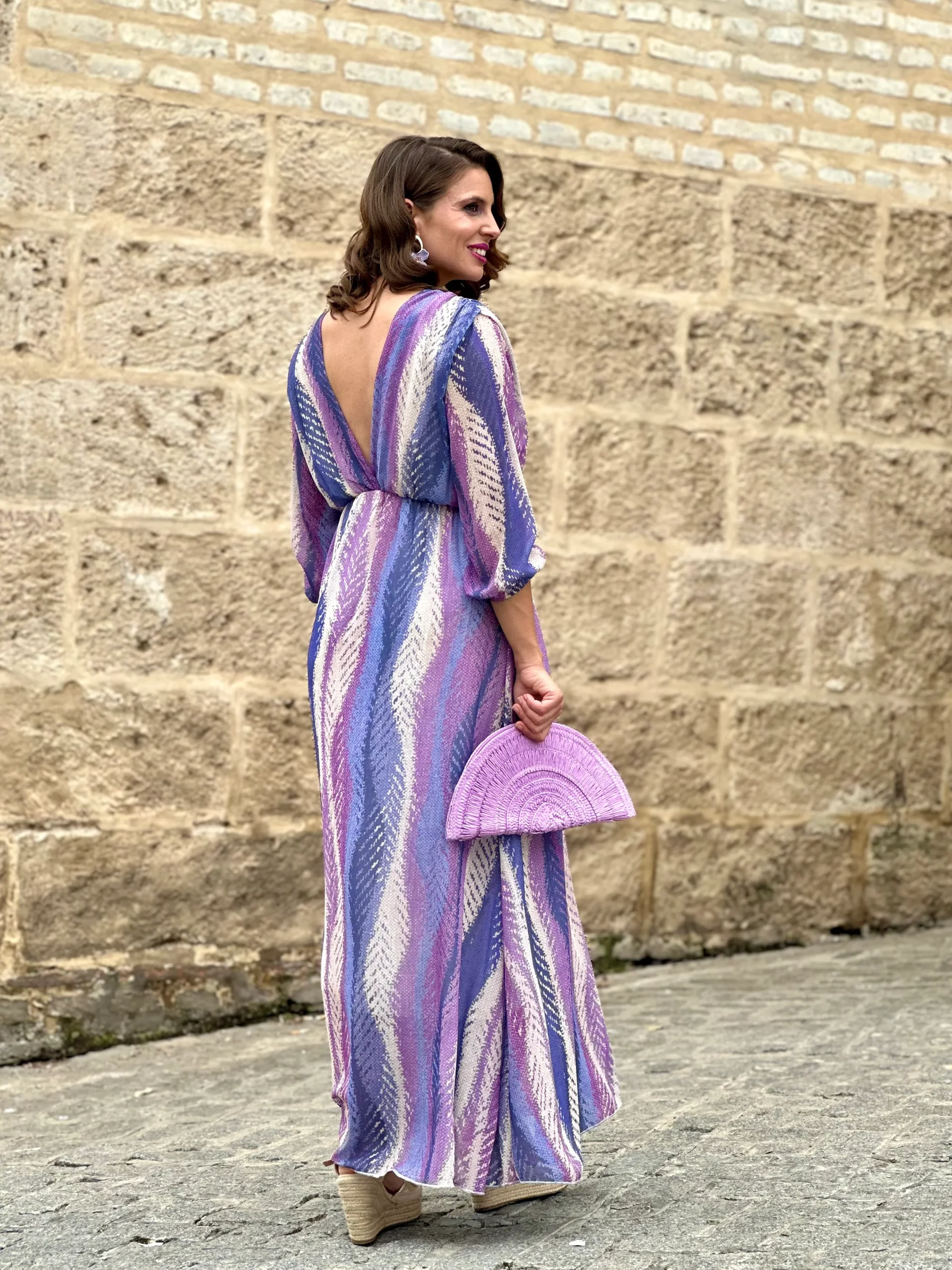 Este vestido largo es la opción perfecta para quienes buscan un look sofisticado y lleno de estilo. Su tejido fluido presenta un estampado en tonos lilas, violetas, azulados y crudos que se combinan en un diseño geométrico muy favorecedor. El escote cruzado realza la figura y la goma bajo el pecho aporta comodidad y sujeción. Las mangas francesas ligeramente abullonadas aportan un toque elegante y actual. Ideal para eventos de día, bodas, comuniones o cualquier ocasión especial en la que quieras destacar. Combínalo con accesorios en tonos neutros o pastel para un resultado impecable.