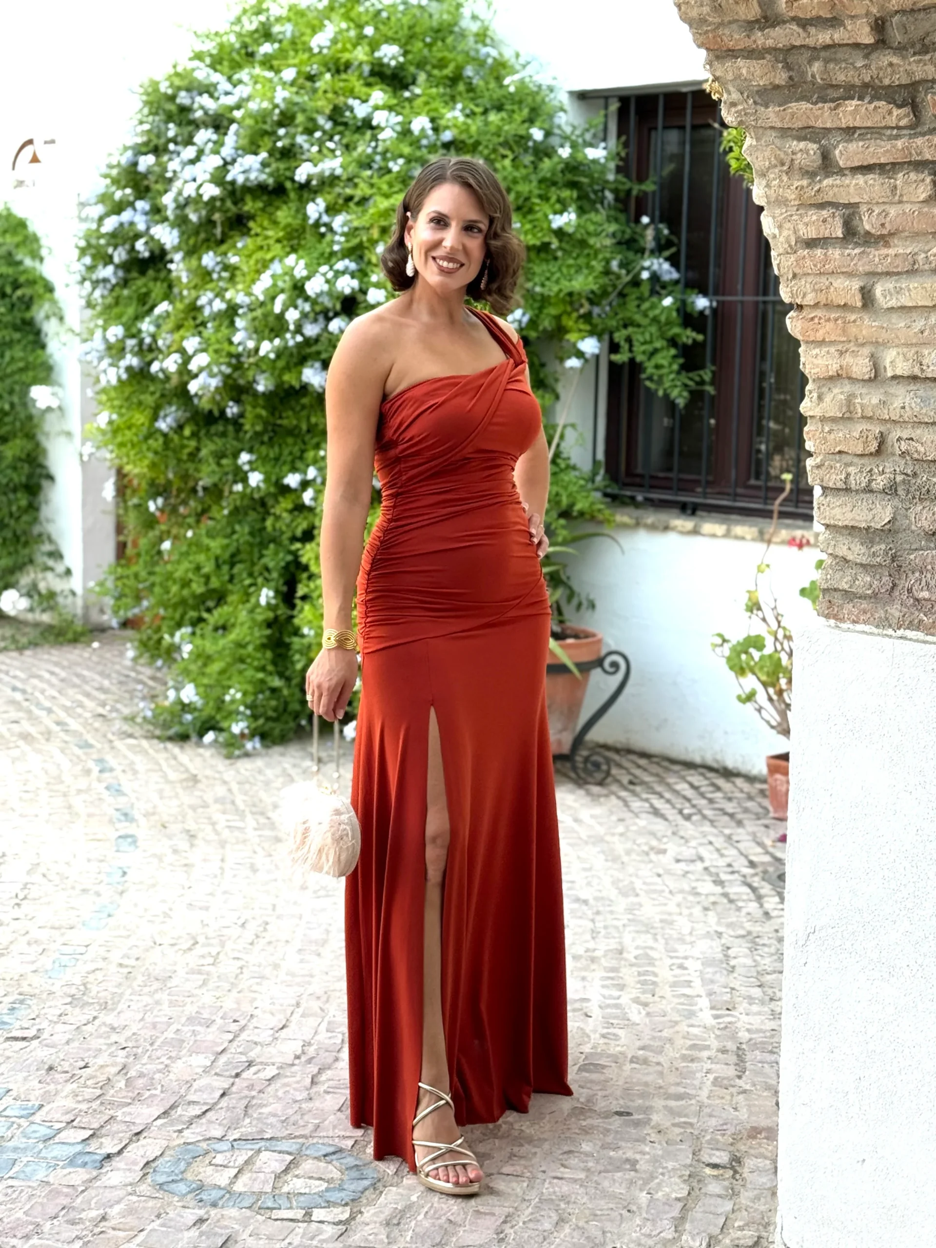 Con un corte asimétrico que realza el hombro, drapeados que estilizan la silueta y una abertura lateral que aporta el toque de sensualidad perfecto, este vestido en tono teja es ideal para invitadas que buscan sofisticación y fuerza en un solo look.