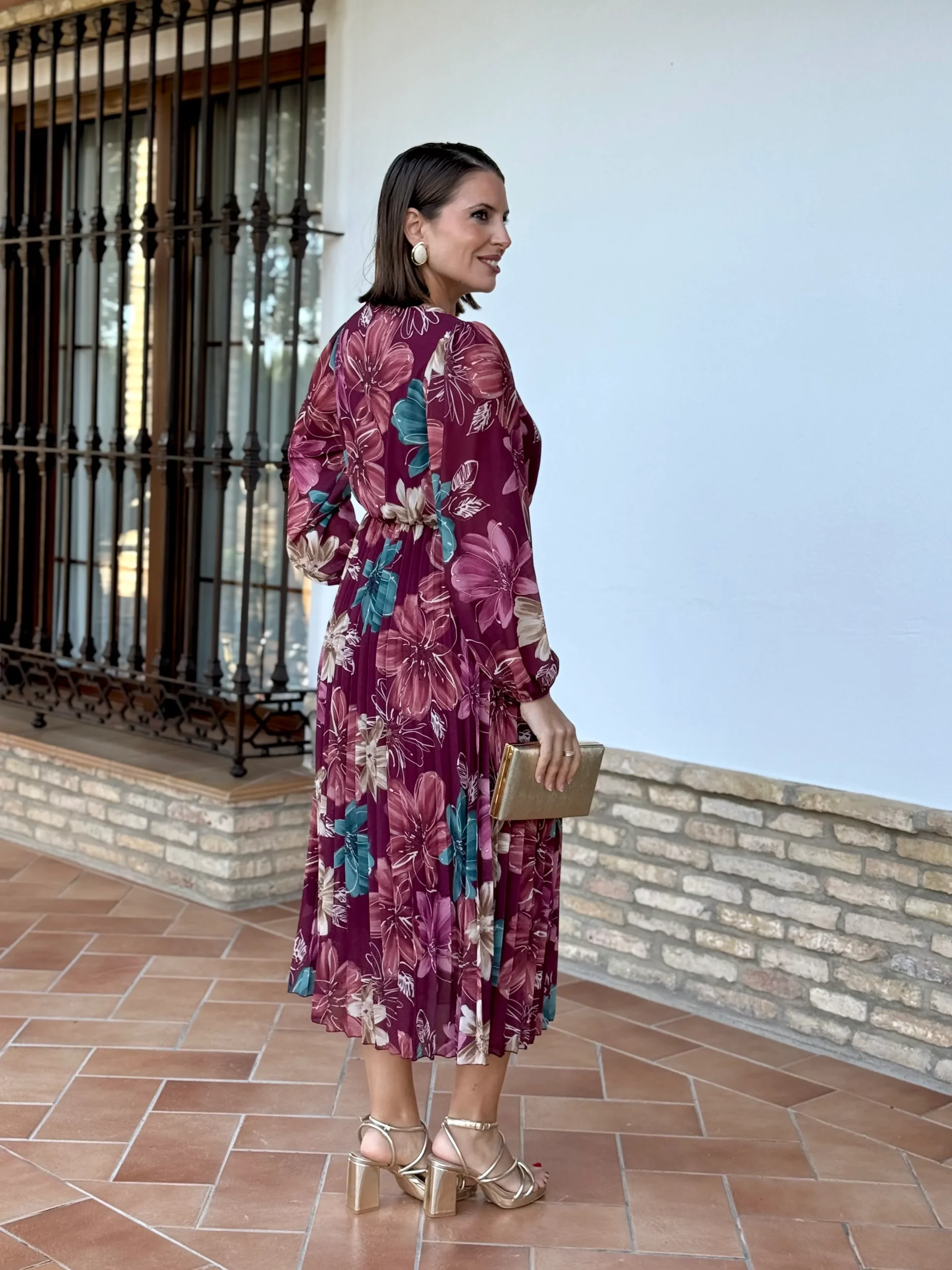 Vestido de invitada elegante y femenino, ideal para bodas, comuniones y eventos especiales. Confeccionado en tejido fluido con ca铆da ligera, destaca por su sofisticado estampado floral en tonos burdeos, verde petr贸leo y beige, una combinaci贸n perfecta para eventos de oto帽o, invierno y entretiempo.