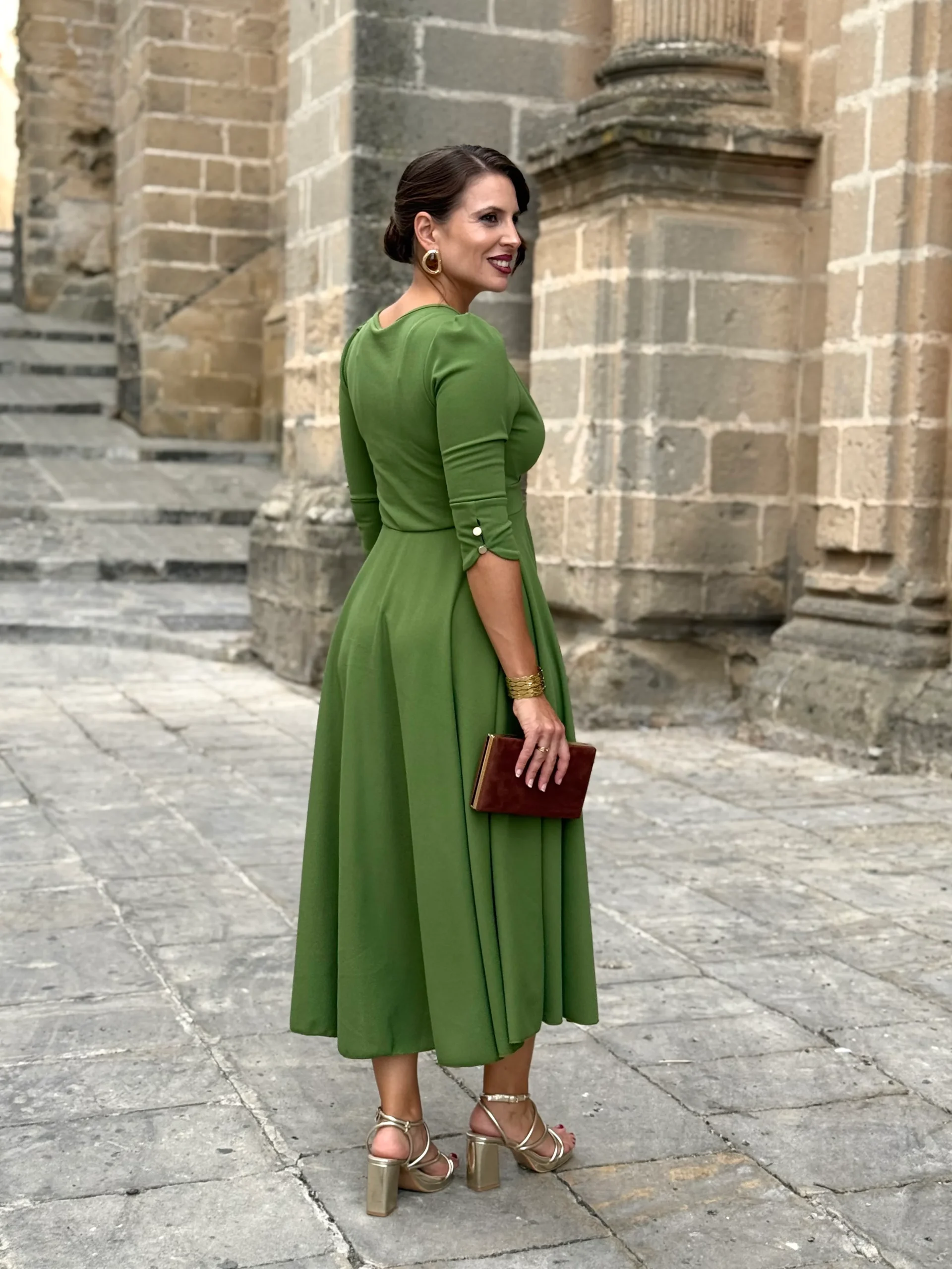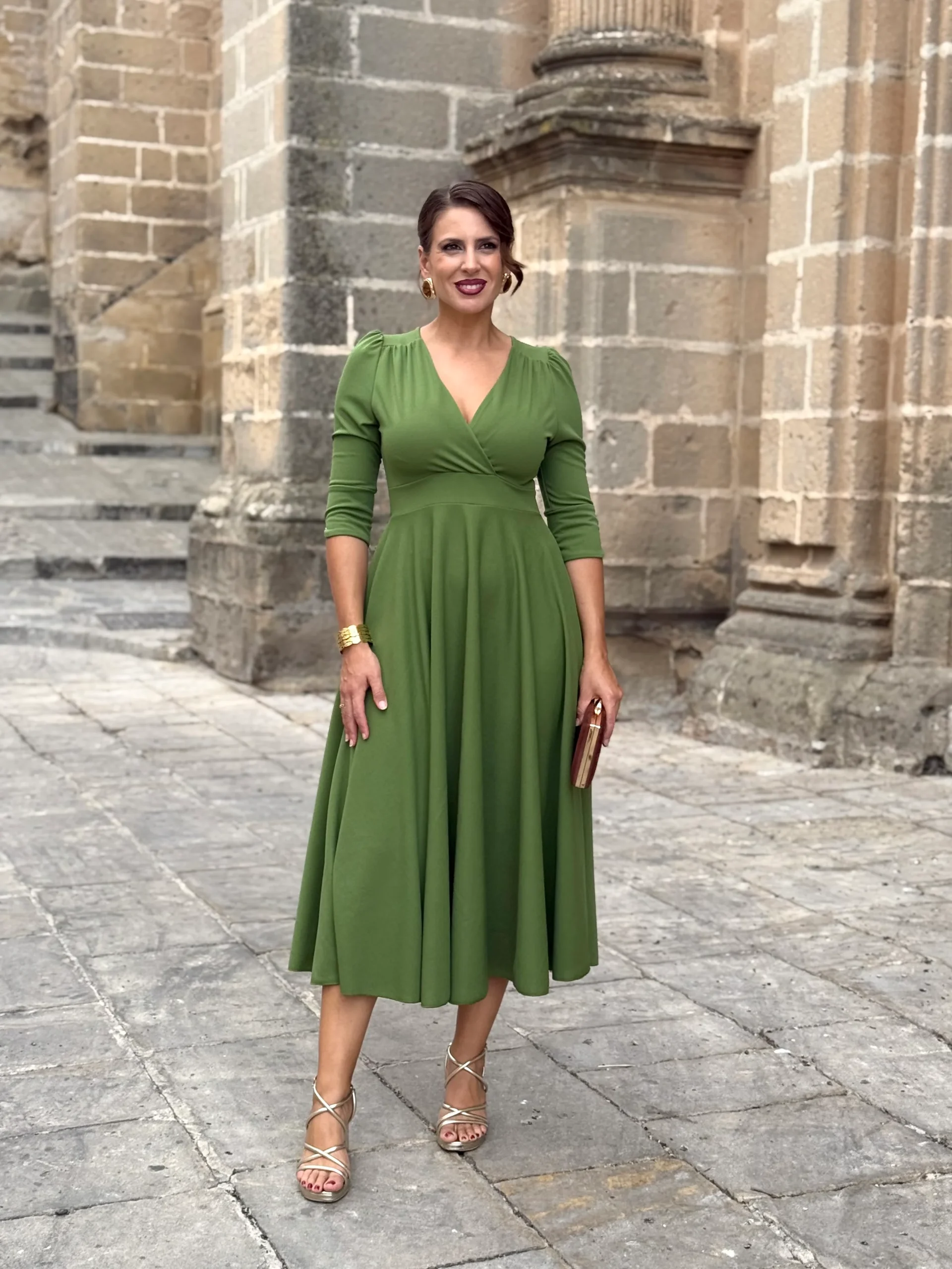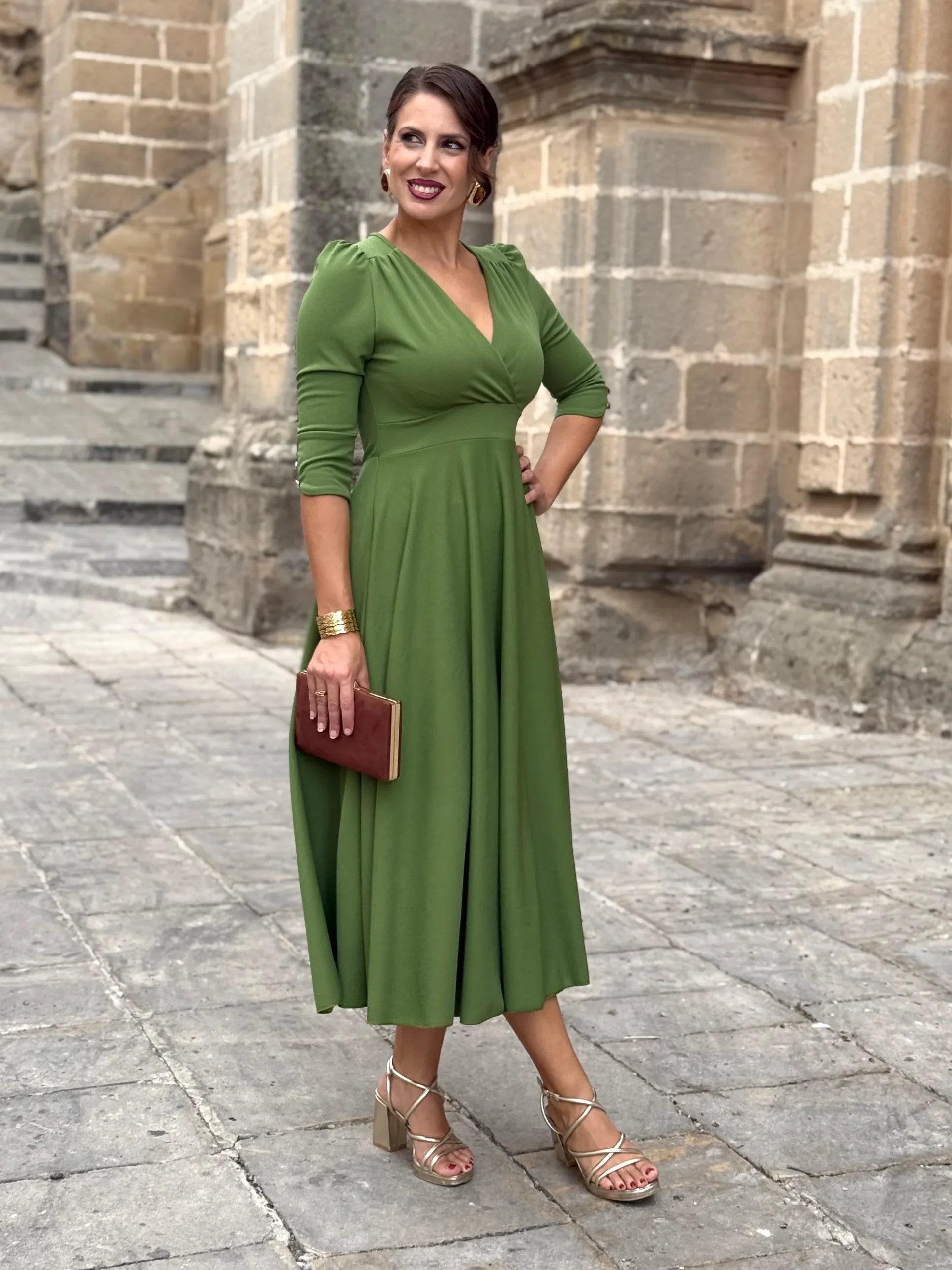 Descubre nuestro vestido midi de invitada de boda, un dise帽o elegante y atemporal que realza la silueta femenina. Con escote cruzado en pico, manga francesa ligeramente abullonada y falda de vuelo con movimiento, se convierte en la elecci贸n perfecta para cualquier evento especial.