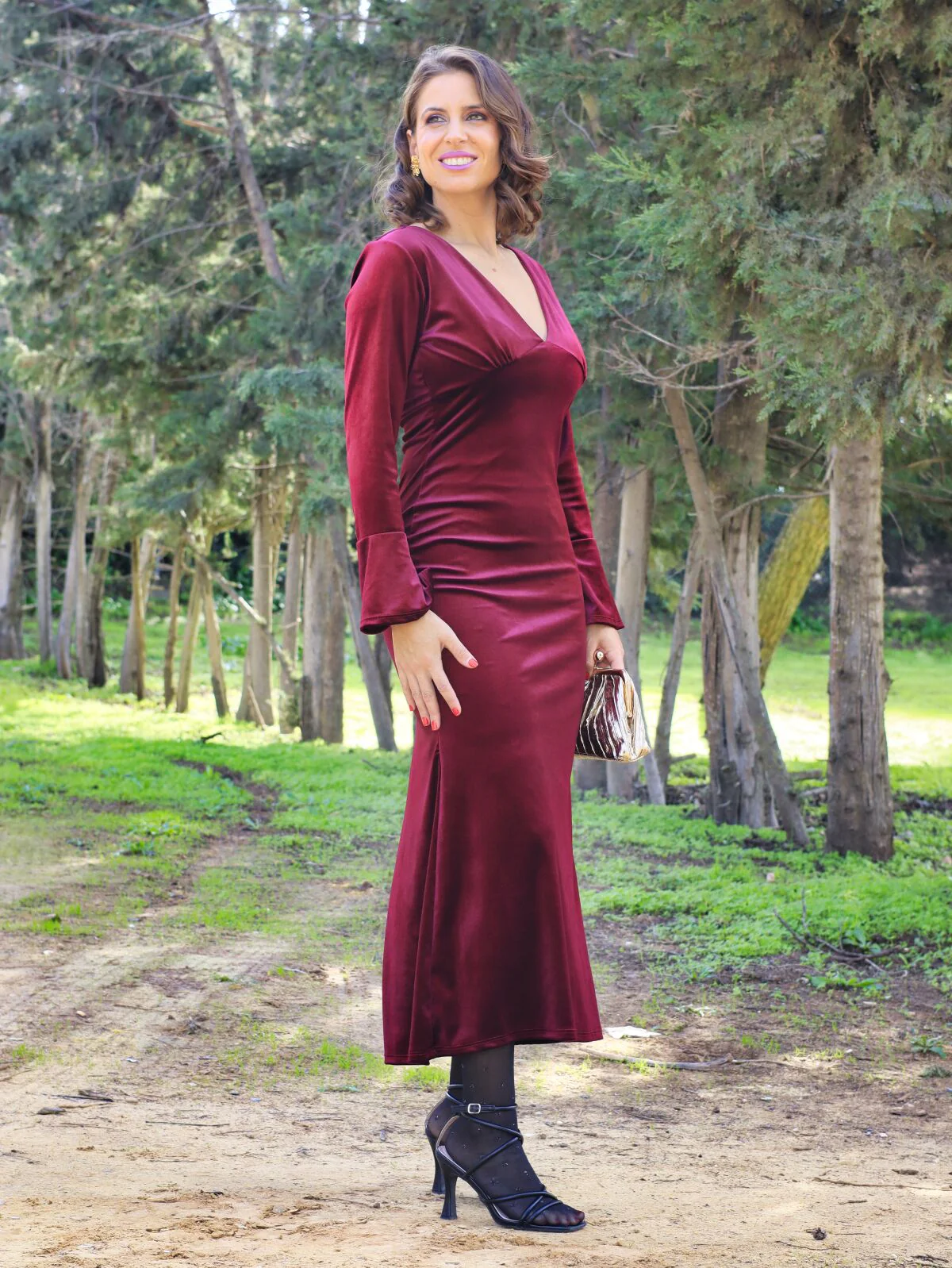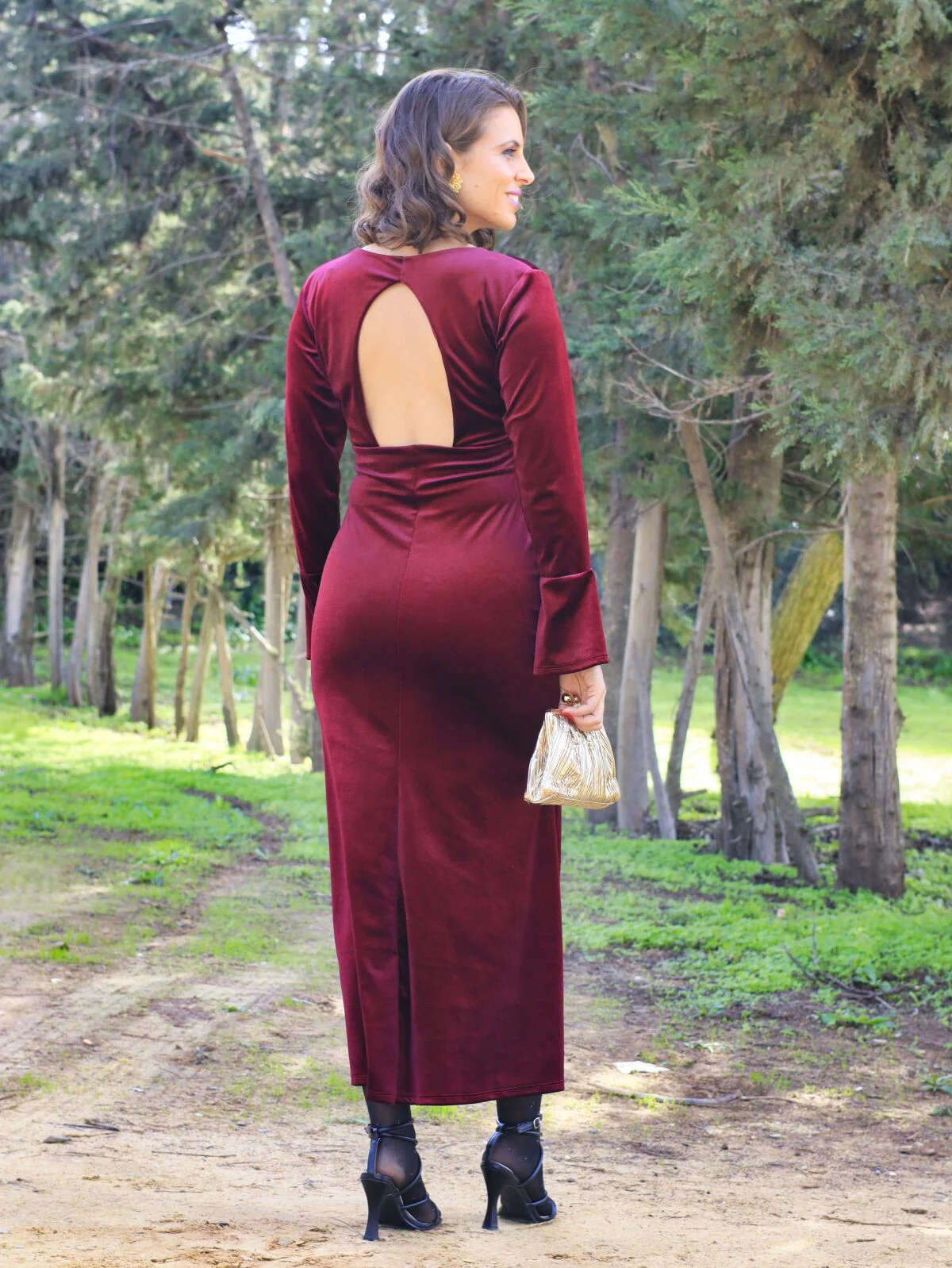 Vestido con escote en V, tiene mangas terminada en un volante, espalda descubierta, falda ajustada al cuerpo.