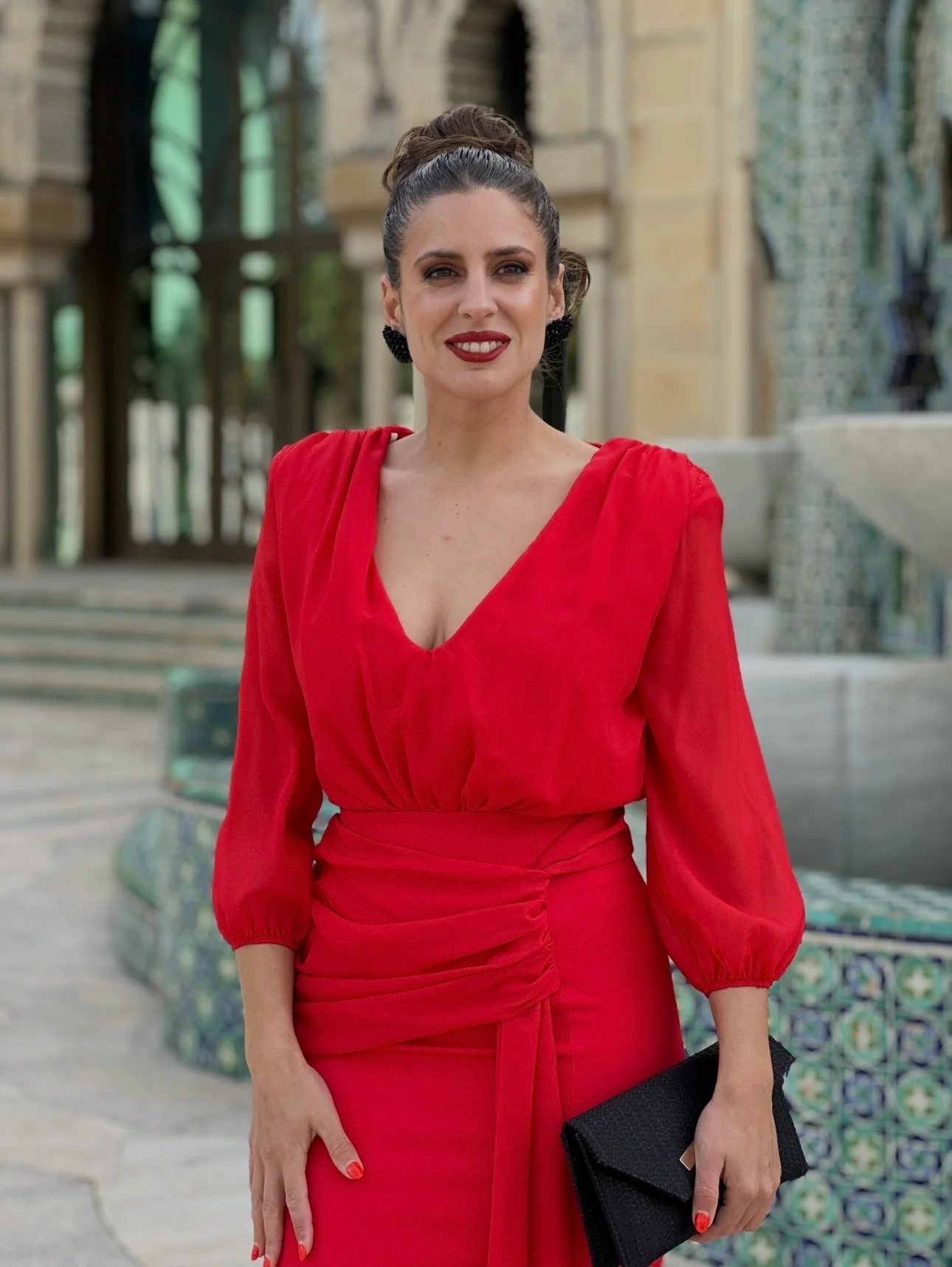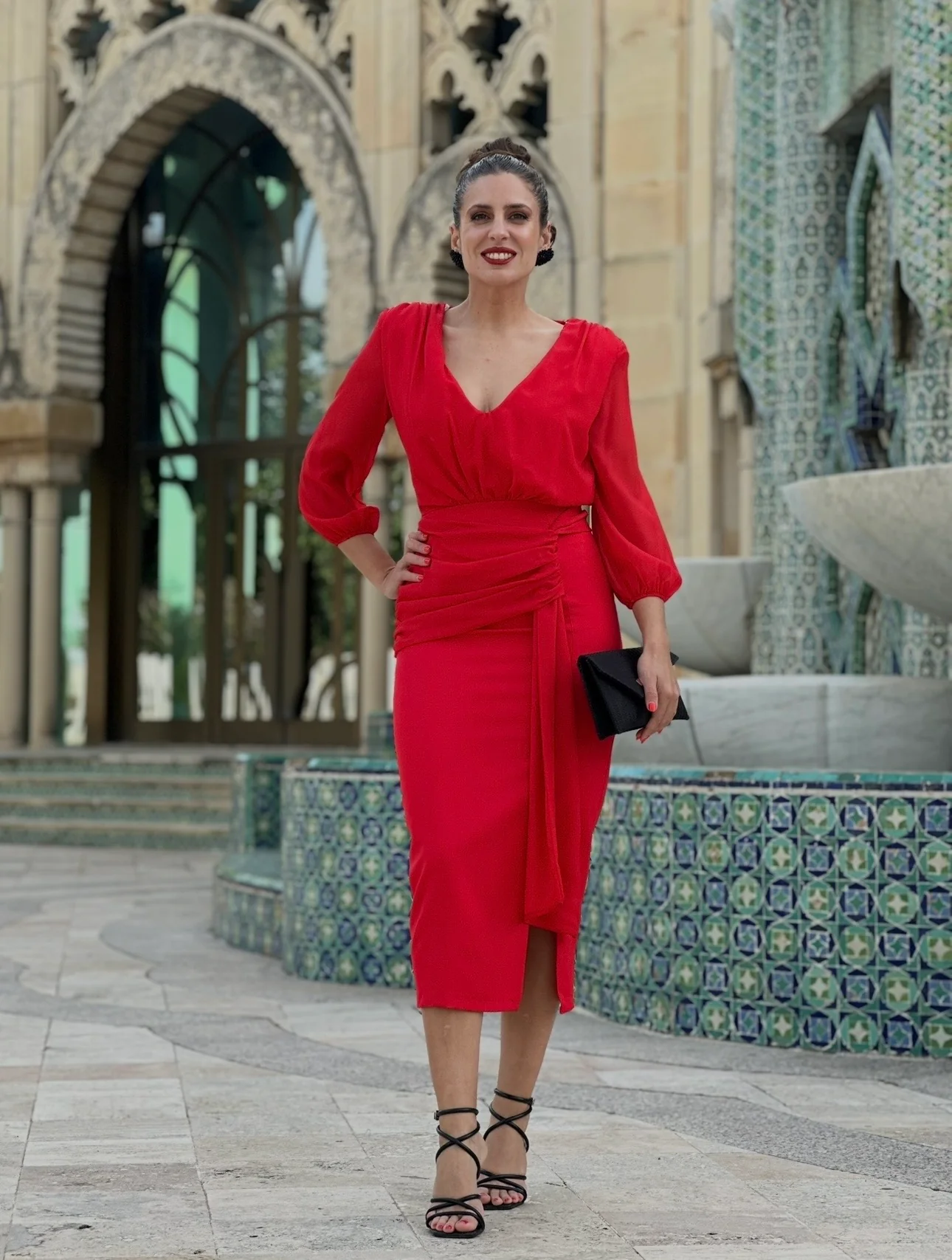 Vestido midi con escote en V, con mangas 3/4, parte superior del vestido y detalle en la cintura es de gasa. Falda ajustada al cuerpo, terminada en abertura lateral. Tiene forro.